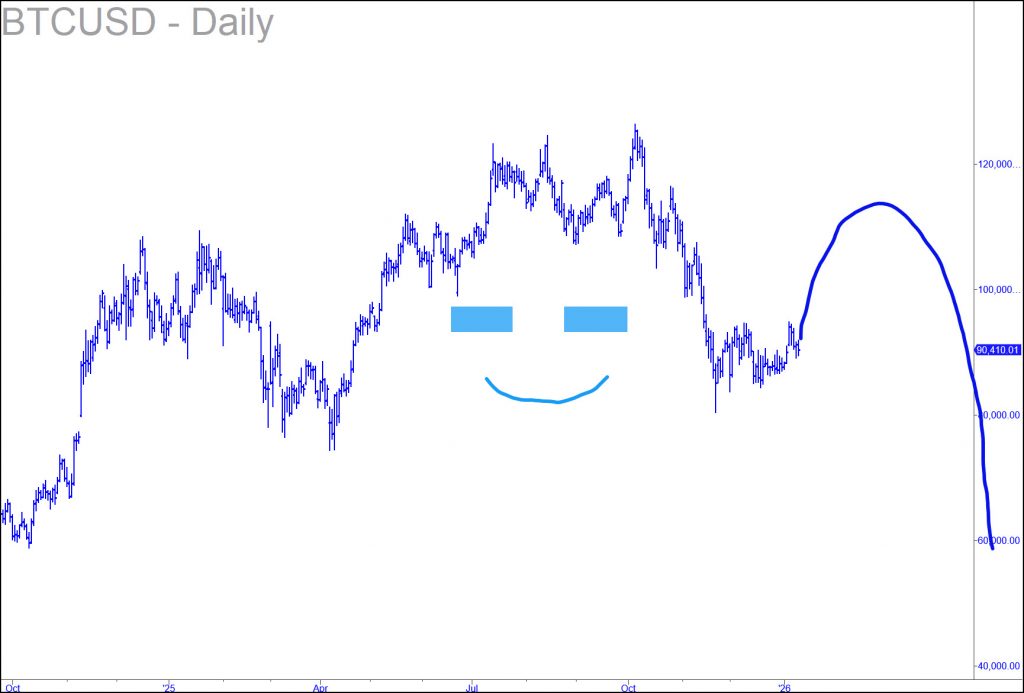 Bitcoin tallied enough votes to remain on the list, but that doesn’t mean it will get any respect just for being here. This week’s chart avoids visualizing an ABCD pattern that would probably prove too conventional for a rabid badger like this one. Instead, I have extrapolated an imagined head-and-shoulders