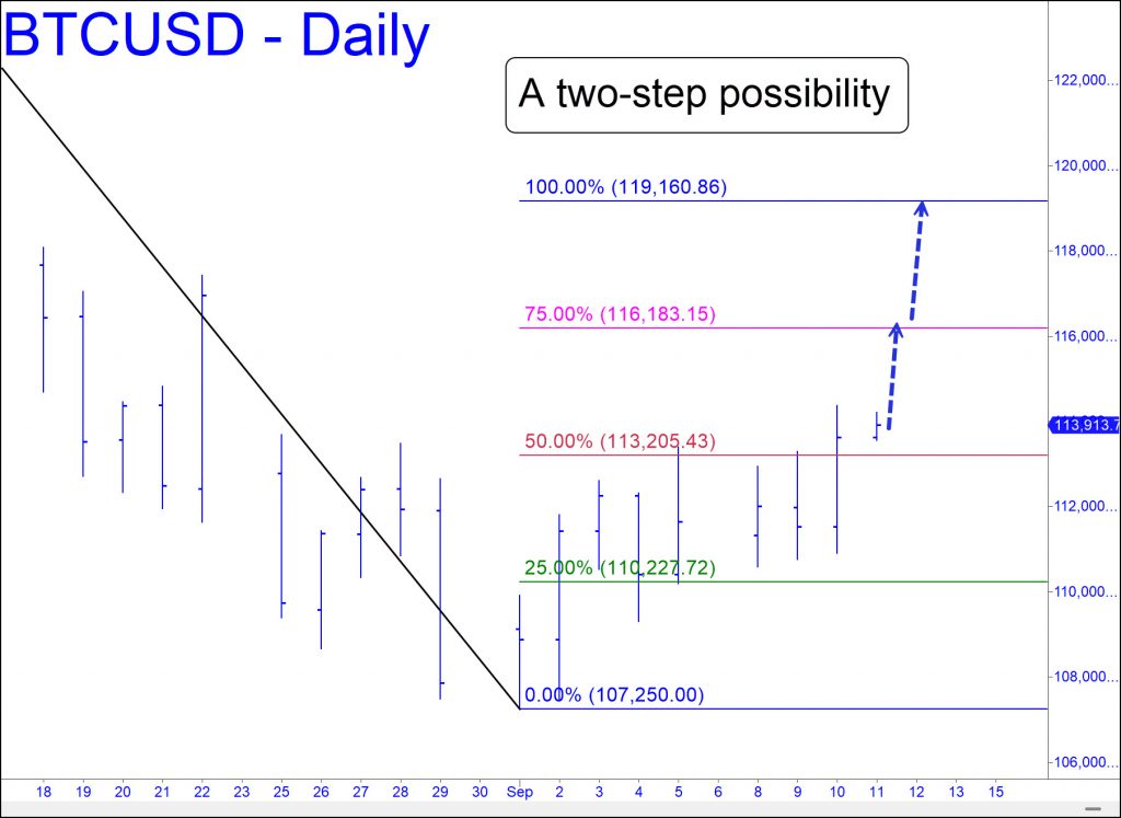 Bitcoin’s bounce two weeks ago from within a hair of a correction target at 107,064 has gotten legs and now promises more upside over the near term to as high as 119,160. Bulls have all but clinched a move to at least 116,183, the ‘secondary’ Hidden Pivot resistance (p2) of