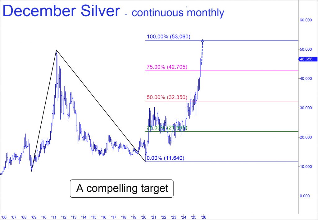The 53.05 target shown is the highest that can be projected for Silver on a long-term chart. It is unlikely to work precisely, since the chart is a blend of different contract months, and because the pattern itself will be too obvious to too many. Even so, the target is