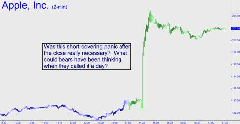 Apple shares took a stealth approach yesterday to achieving a 199.90 rally target that we’d touted last week as a “lead-pipe cinch.” The stock had gyrated gratuitously all day, settling a measly $2 higher at 189.95; then, after the close, it rocketed $15 higher. It’s hard to imagine why every investor on the planet would not have been long AAPL shares when regular-hours trading ceased at 4 p.m. Eastern. Shortly thereafter, Steve Jobs & Co. announced a 47% jump in quarterly profits. This could have surprised no one who has been to the mall lately, since Apple stores are among the very few that teem with activity at all hours of the work day, not just on Saturday afternoons. (We should mention that Verizon stores share this trait, as far as we have been able to observe.)
