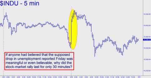 Let’s see if we’ve got this right: Traders pummeled gold on Friday, sending it down $66 an ounce, because unemployment reportedly downticked to 10 percent, implying the U.S. economy is strengthening, which would be bullish for the U.S. dollar, which would be bearish for gold. That’s the theory of it, anyway – and never mind the fact that no one in America outside of newsrooms even remotely believes whatever unemployment statistic the Labor Department concocts from one month to the next; and even less do they believe it when said statistic purports to show that the economy is improving. Wall Street pros pretended to believe it, though — for just long enough to short-squeeze bears at the opening bell. But look at what happened next: After only 30 minutes on the rack, the bears went limp, suddenly becoming unavailable to help unwittingly foster the bizarre illusion that no investor can afford to delay buying stocks at these “bargain” levels.