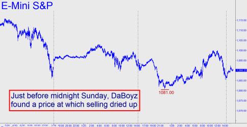 Yesterday’s failed rally demonstrated once again that short-covering remains the only force capable of pushing stocks higher on a given day. It also showed that there are no longer enough nervous bears around to drive the market into a sustainable uptrend. In this latest show of false strength, the Dow Industrials achieved maximum loft about midway into Tuesday’s session, when they were up about 100 points. But the set-up for this bull-less rally came the night before. As is nearly always the case, off-hours activity in the electronic index futures was used to catalyze buying urgency ahead of the opening. Notice in the chart below how the E-Mini S&P futures were actually down significantly Monday night. Shortly after midnight EST, eight hours after night trading began, the E-Mini S&P hit a low of 1081.00, off 11.25 points from the previous day’s settlement price. At that point, the futures were predicting the Industrial Average would open down almost 100 points on Tuesday.