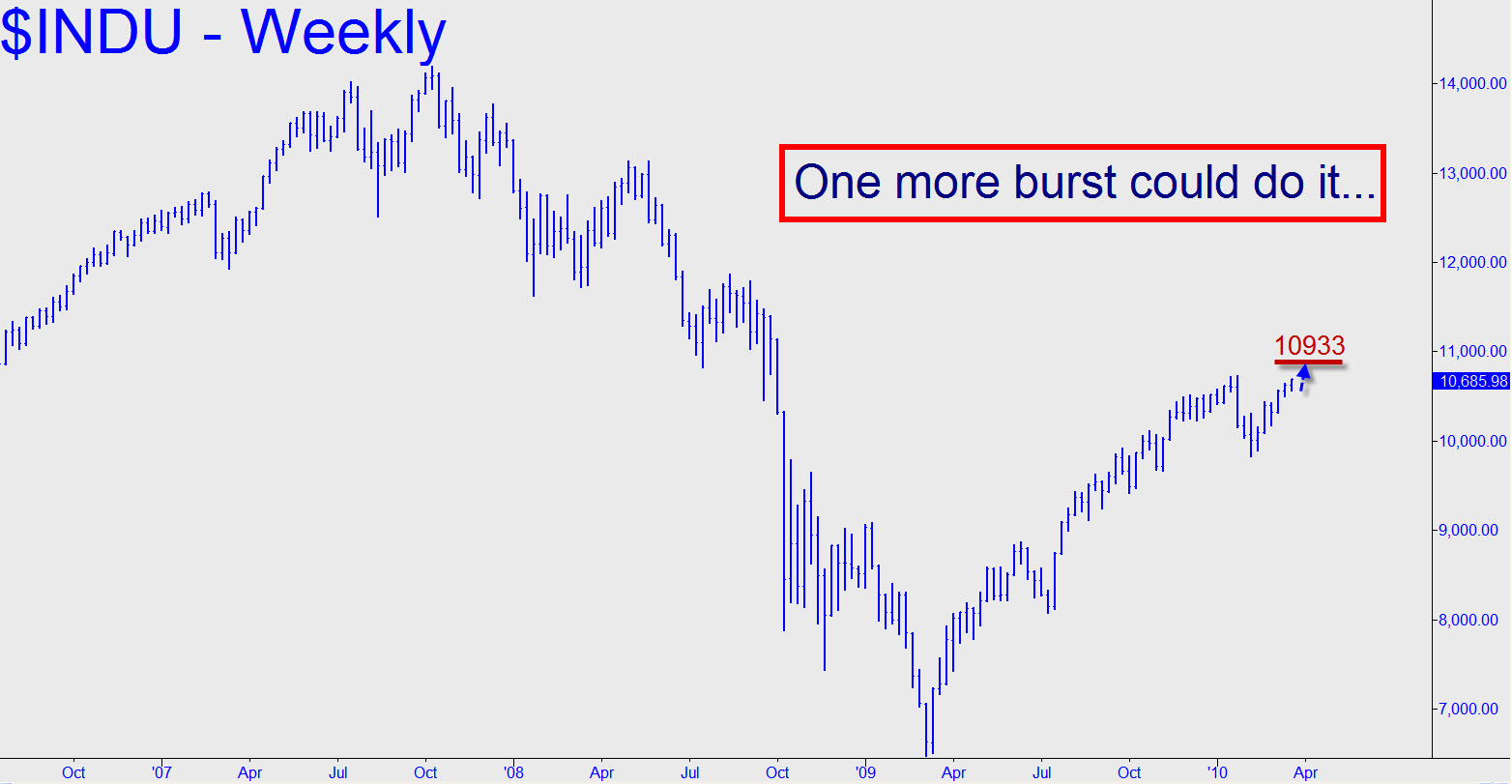At yesterday’s top, the Dow Industrial Average was a mere 239 points shy of equaling the six-month bear rally that followed the 1929 Crash. The blue chip average peaked at 10694 on Tuesday, but it will need to hit 10933 to equal the fervently delusional retracement of the Great Crash to within 77% of the market’s peak value. At the rate the Dow has been climbing, it could be there by week’s end or early next, so place your bets. We’ve can identify one spot between here and 10933 where a short would enjoy favorable odds, but the gambit demands a tight stop-loss.