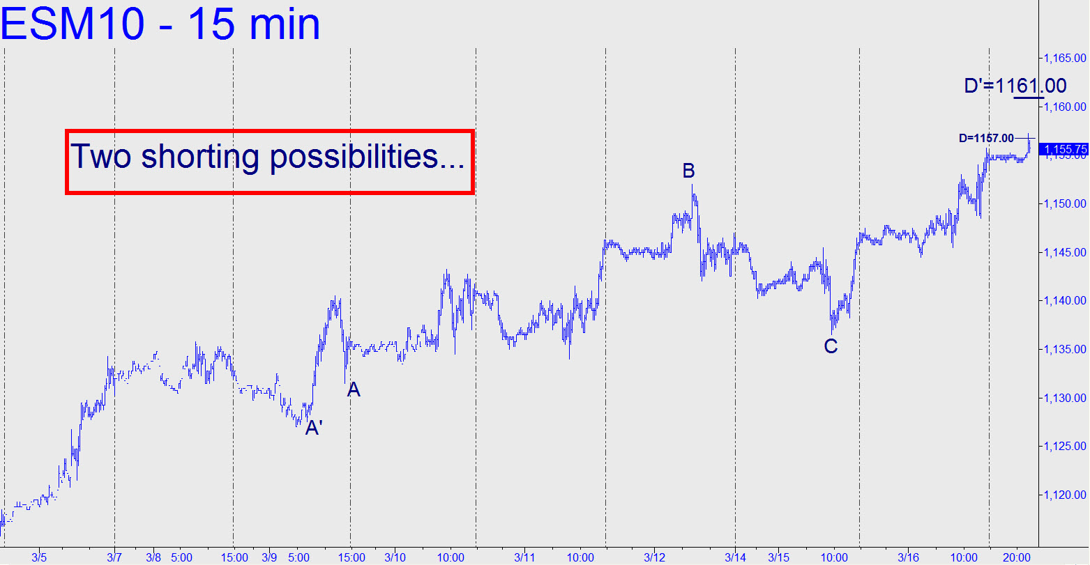There are two targets just above that look like enticing shorts. The first lies at 1157.00, but I am wary of initiating a position there because the futures have already hit 1157.25 as of midnight and the night is still young. The second lies at 1161.00 and would give us a little more cushion against what looks to be a developing short-squeeze. The risk is that the top will occur below our offer, perhaps at 1157.25. In any event, I’ll recommend offering two contracts short at 1161.00, stop 1162.25. The chart shows the two relevant patterns.
