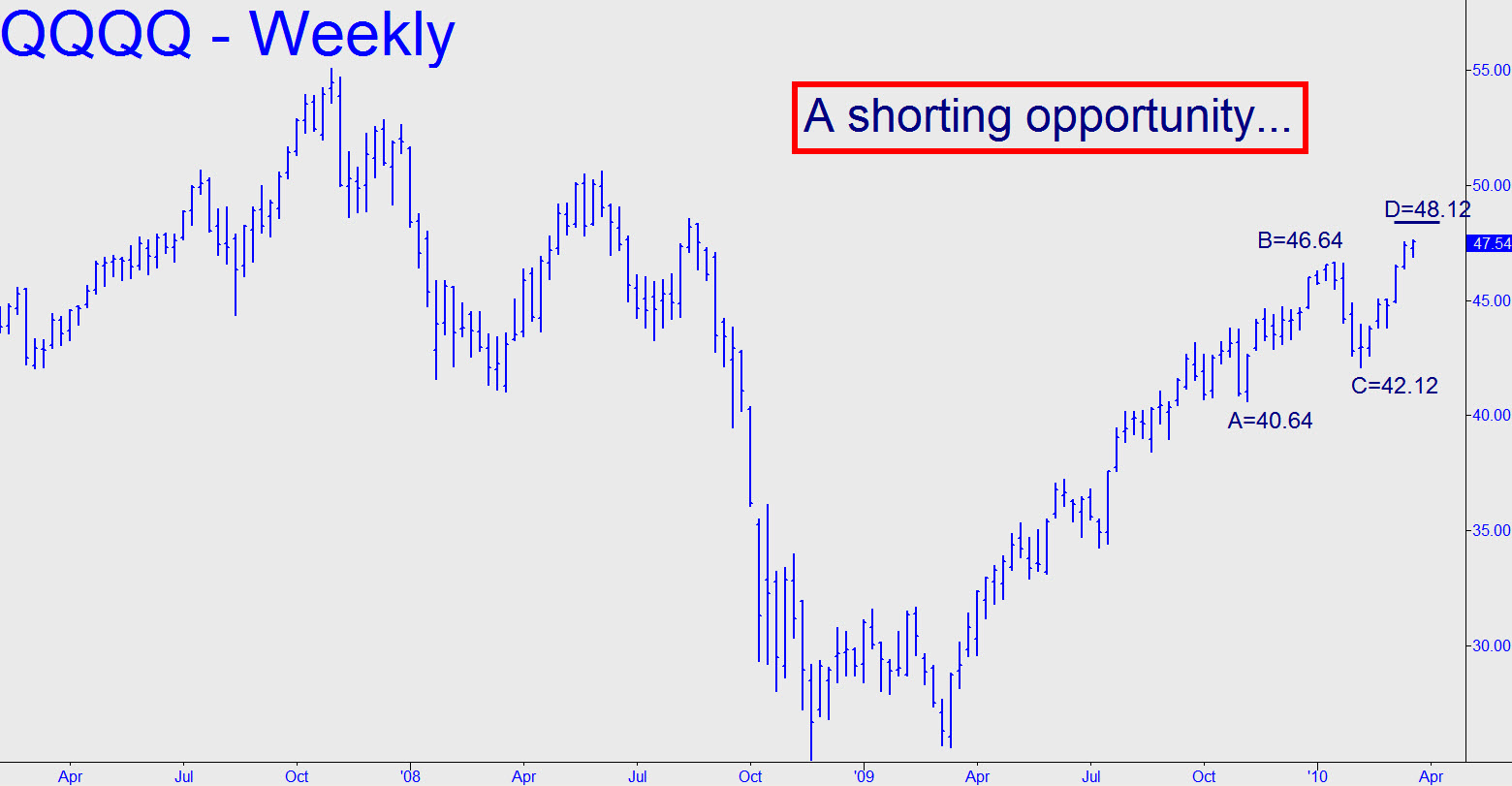 Irrespective of whether the Dow is about to rally 239 points to tie the 1930 recovery, we should try to short this vehicle when it reaches the 48.12 target shown in the chart. Buy four April 48 puts, which should be selling for around 0.90 at the time, no stop-loss.
