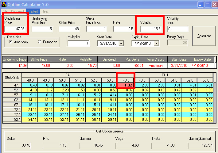 From an original position of four April 48 puts purchased when the QQQs were topping on Friday, we hold two contracts with a cost basis that has been lowered by profit-taking to 0.56. Now let’s offer another put to close for 1.32, where I estimate they should be trading if the Cubes fall to a 47.09 target. That’s a Hidden Pivot, and it can serve as our minimum downside objective for the near term. I’ve included a snapshot of a calculator that helped me determine a fair value for the puts. The 15.7 volatility came from Tradestation OptionStation Analysis and represents implied volatility for the “offer” side of the spread.