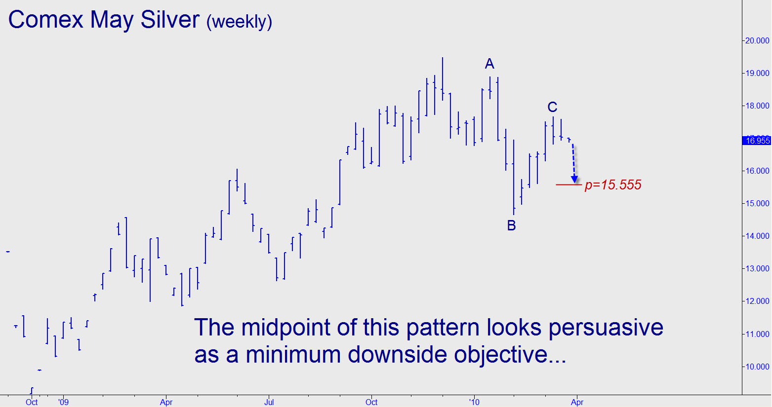 The 15.555 downside target shown in the chart, a midpoint pivot that comes from the weekly bars, looks compelling enough to take seriously. We’ll use it as a minimum downside objective for now and plan on bidding aggressively if the futures approach it. More immediately, it would take a print at 17.165 today to turn the very lesser charts bullish.
