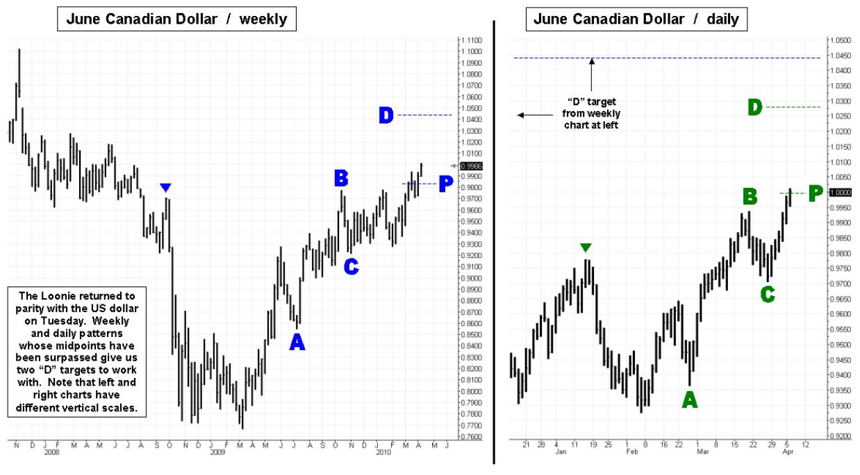 The Canadian dollar regained parity with the US dollar on Tuesday and looks to be headed higher. Daily and weekly patterns for the June futures give us “D” targets at 1.0279 and 1.0439, the first of which can be shorted with a stop at 1.0286. In the meantime, traders should look for a way to get long. If the sustained uptrend from the 0.9705 level (the “C” point on the daily chart) is interrupted, keep an eye on the midpoint of the weekly pattern at 0.9828. Otherwise watch for a high-quality intraday pattern to provide the opportunity. (Posted by Doug McLagan) _______ UPDATE (April 19, 02:35 p.m. EST): The Loonie came back down to the weekly midpoint pivot of 0.9828 and respected it for about 18 trading hours before moving somewhat lower. There has been little follow-through, however, and this market remains bullish with still-active daily and weekly patterns. The situation is no longer considered actionable, but we will keep an eye on it.