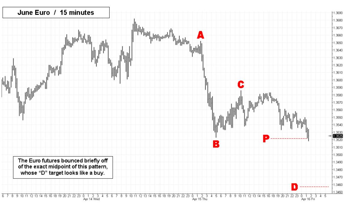 An intraday pattern in the June Euro futures gives us a “D” target that looks buyable. The Euro has been dithering all week after popping up from a double-bottom on the daily chart, which came in just above the midpoint of a large weekly pattern. If we like the odds that the Euro has made an important low, we should look for opportunities to get long such as this “D” target at 1.3457. Traders can risk as much as $138 per contract with a buy at 1.3460 and a stop at 1.3449, but the small size of the pattern would justify a tighter range than that. (Posted by Doug McLagan) _______ UPDATE (April 19, 02:20 a.m. EST): The Euro futures dropped to our entry point, hesitated for half an hour, and then stopped us out by two pips. The subsequent bounce has been anemic.