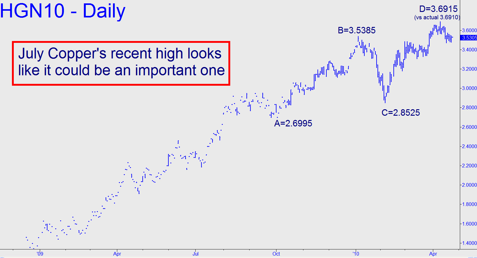 I don’t track Copper very closely, and so I missed what could turn out to be an important top recorded two weeks ago. As you can see in the accompanying daily chart, the actual high came within 0.005 points of a quite clear Hidden Pivot target. If Copper were to push above that target within the next week or two, it would imply that there is sufficient buying power to push the futures for yet more weeks, if not months.