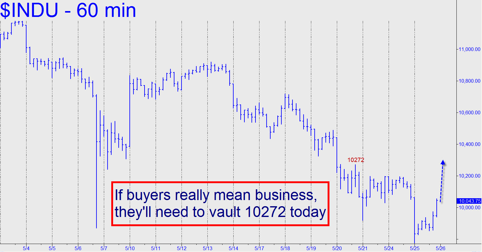 How far can this short squeeze go, right? Many of those who bought into it may feel chastened when the markets spring to ostensible life Wednesday morning, so don’t expect the hysteria to work wonders for a second straight day. Fortunately, we can use an objective benchmark to tell us if things are getting out of hand: last Thursday’s 10272 peak. Any progress above it today would need to be taken seriously, even by those of us who have to stifle a laugh every time stocks leap the Wall of Worry in a single badly misconceived bound.