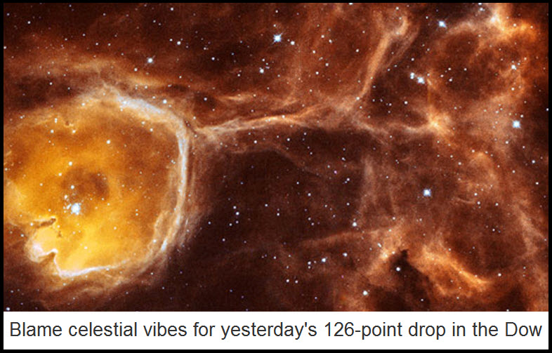 We peruse the Wall Street Journal’s stock-market round-up each day not to find out why stocks may have risen or fallen, but to determine what factors are conventionally thought to have caused such price movements to occur. This is an important concern for forecasters, since, even if one attempts to get a read on the market using purely technical means, it still helps to understand what is on the diseased brains of the coprolagniacs whose job it is to manipulate shares to the certain benefit each day of Goldman Sachs, J.P. Morgan and other officially sanctioned predators of the securities world. The very difficult task of explaining the stock market’s behavior to readers of the Journal falls most often to columnist Peter McKay, and we don’t envy him his job. Because he works for one the most important and prestigious financial publications in the world, it simply won’t do for him to say, as we might (and often do), that stocks rose or fell the previous day for no good reason at all – or at least, for no reason remotely related to reality. We think celestial factors play a far bigger role in this than mainstream pundits will ever be permitted to acknowledge, and that a gypsy fortune teller is therefore better equipped than the highest-paid analyst on Wall Street to tell us why the broad averages are likely to go either up or down.
