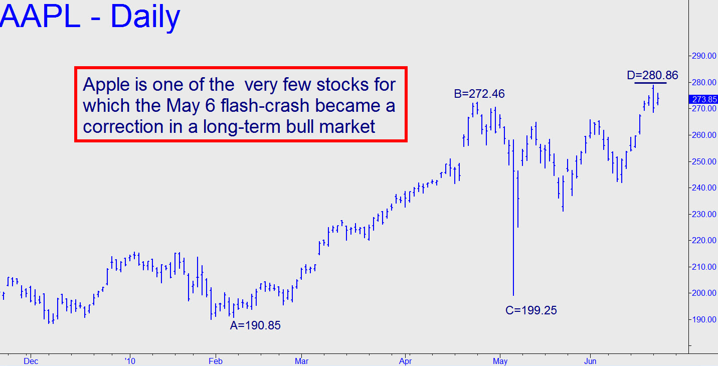 AAPL is one of the very few stocks for which the May 6 “flash crash” became a corrective leg in a still-viable long-term bull market. That’s the good news. The potentially bad news, at least for the intermediate-term, is that Monday’s high at 279.01 came within 1.85 of an important Hidden Pivot rally target at 280.86. If the stock feints higher over the next day or two, reaching that number, I recommend shorting a round lot of stock with a stop-loss at 282.01. Although I am not bearish on Apple’s long-term prospects, this looks like as good a spot as any to attempt shorting the stock. ______ UPDATE: We’ll put this one aside for the time being, since AAPL has worked lower.