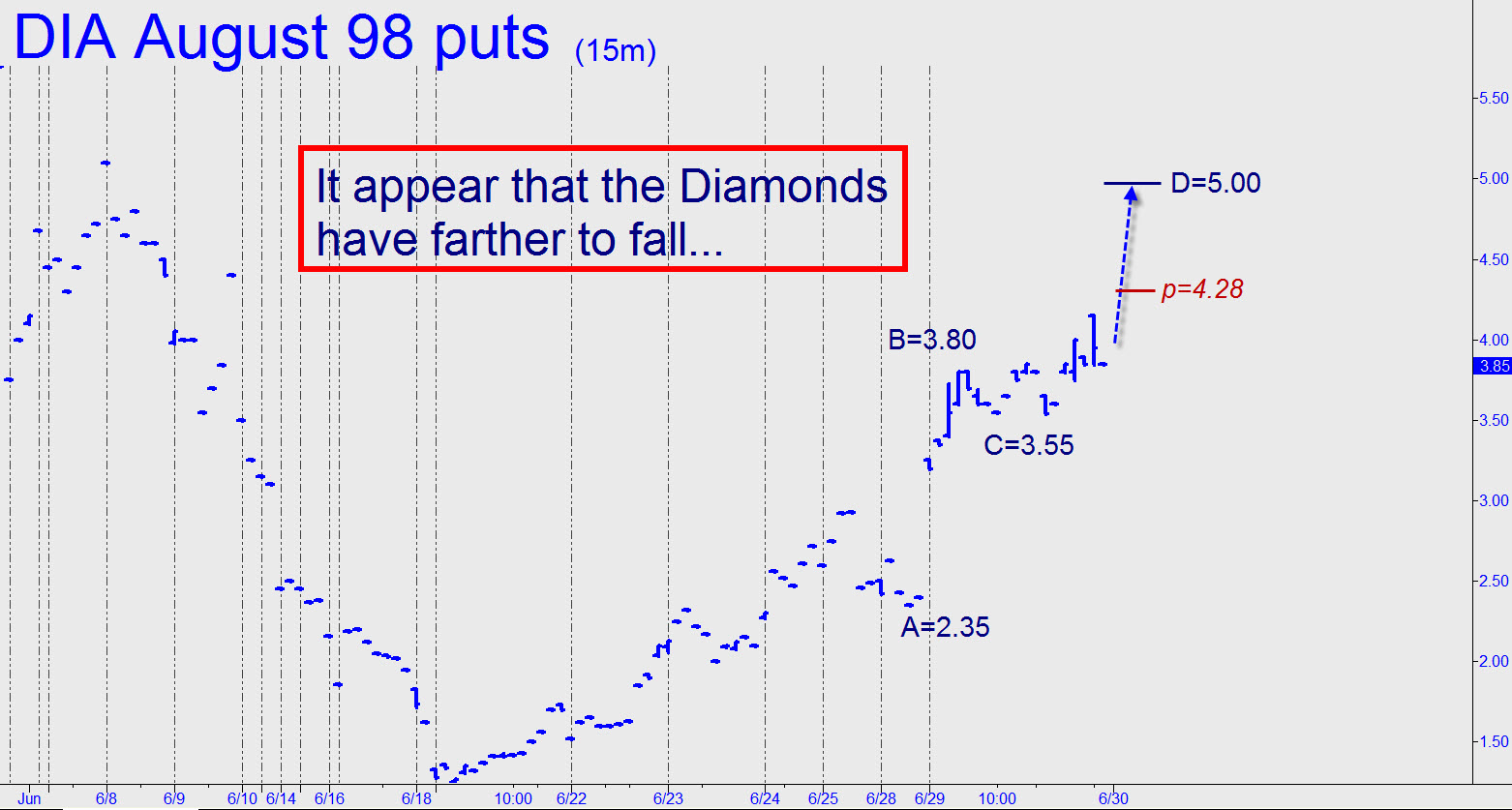 Our small put position is showing a theoretical gain of about $890 following yesterday’s refreshing plunge in the broad averages. We hold two August 98 puts for 1.06 and four July 96 puts for 0.70; they closed, respectively, at 1.54 and 3.85. We should be encouraged by the latter number, since the puts magically traded down to 3.85 after having been as high as 4.15 minutes earlier. What that means is that the thieving dirtbags who are short them — professional market makers, like I used to be — are struggling to hold them down. They may have been “marked” at 3.85 for settlement purposes, but you can bet there weren’t many for sale at that price and that the market makers would have jumped on any serious offers at 3.90 or even 3.95. They project to at least 5.00 right now (see chart), implying that sellers are not yet finished with the Diamonds/DJIA.