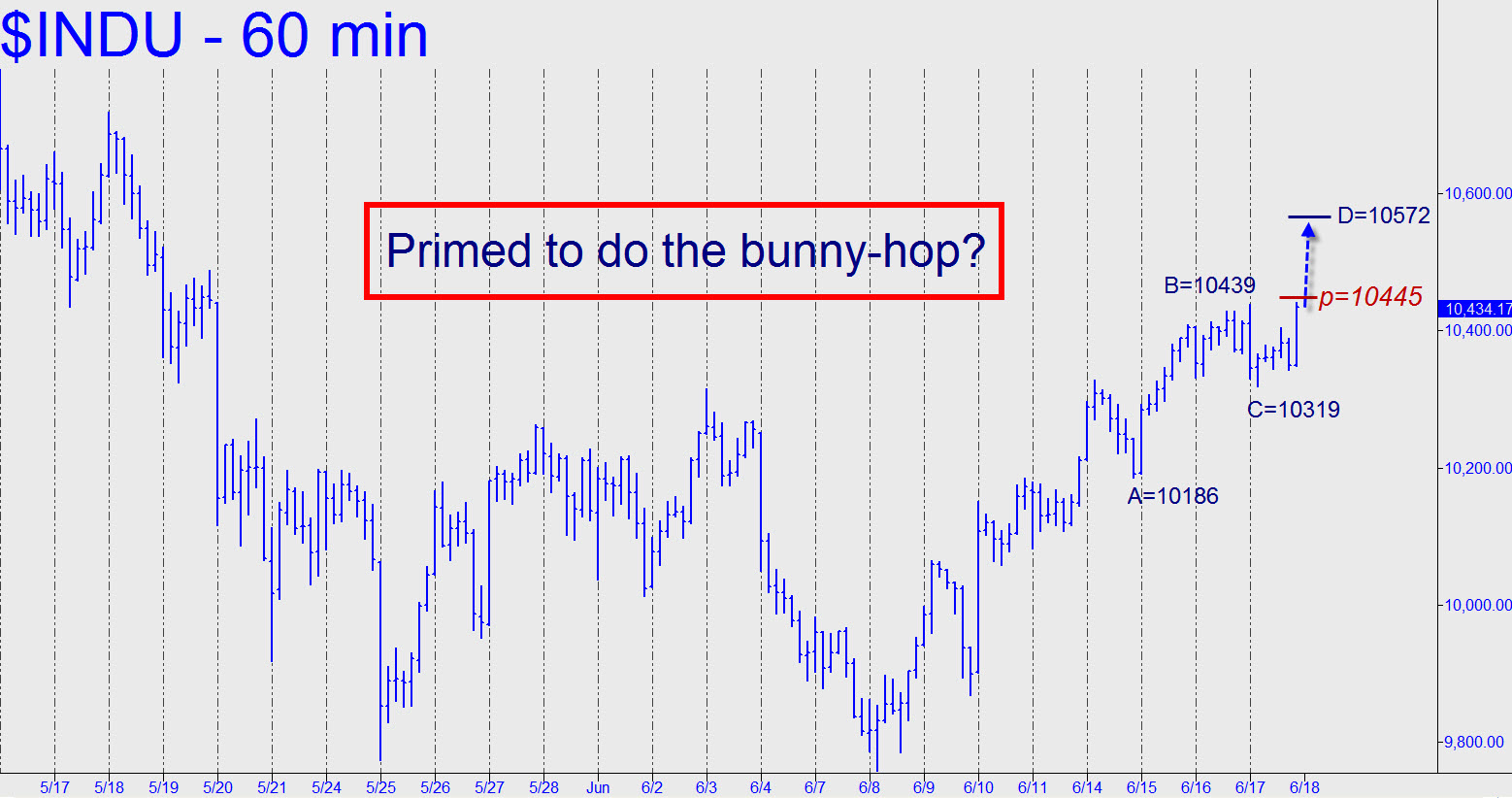 I mentioned a 10572 rally target for the Dow in today’s commentary; the chart show its provenance. The midpoint resistance lies at 10445, just a few points above yesterday’s high, so we might expect quite a bunny-hop if it is taken out. Will it be? The suspense is killing me.