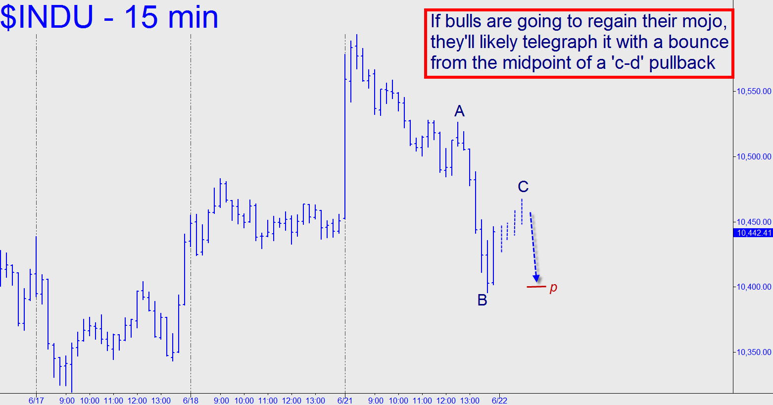 The Dow didn’t fall far enough to create an impulse leg on the hourly chart, but the weakness was nonetheless sufficient to create a so-far bloodless duel between bulls and bears. If the Dow does a 180 today for the usual non-reason and heads higher, you should use 10645 as a target, since that’s where DaBoyz will be taking it once they recover their mojo. For clues that this may be about to happen, watch for a midpoint bounce on the 15-minute chart similar to what I’ve sketched out.