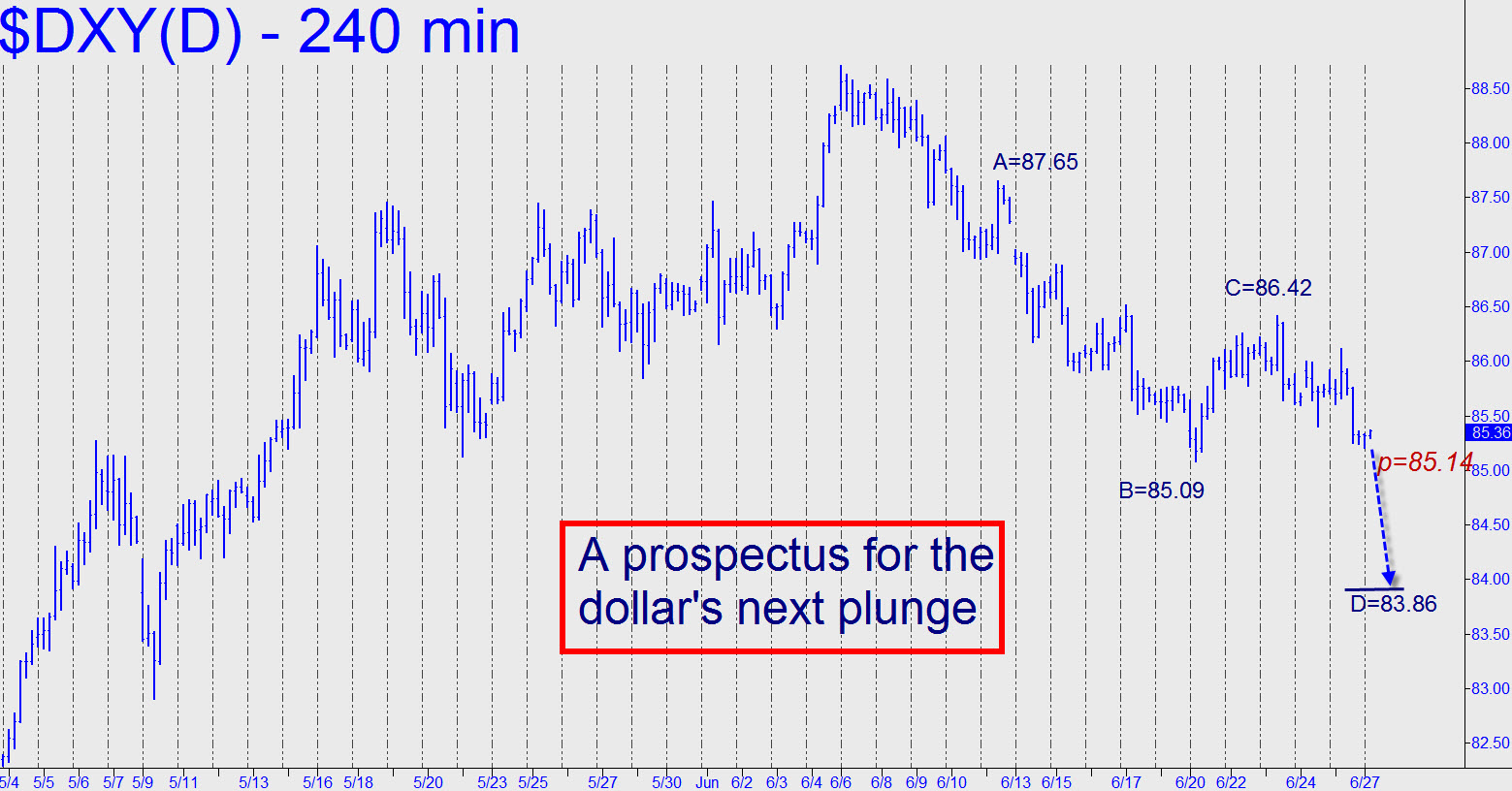 June’s three-week slide is bearishly impulsive on the daily chart, but there’s not enough clarity on the intraday charts to map out the swing lows DXY is likely to carve out on the way down. My guess is that the next big leg will achieve a minimum 83.86, an approximately 2.3% fall from these levels. If so, the crucial midpoint support lies at 85.14, and a bounce off it would tend to corroborate the target itself. _______ UPDATE (9:58 a.m. EDT): DXY has bounced from 85.21 — close enough to the midpoint support for us to infer that the Hidden Pivots are working. A decisive breach of 85.14 should therefore be regarded as a warning of an imminent fall to 83.36.
