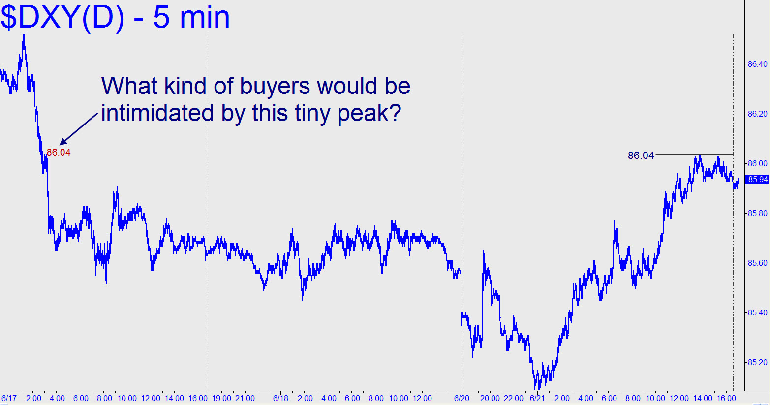 The bounce from 85.09 yesterday occurred close enough to our 85.01 target to imply that Hidden Pivots are calling the dollar’s tune. If so, there are signs of weakness already starting to creep into the rally, since it should have reached 86.16 but only got to 86.04 (at least so far). Another subtle sign that bulls are lacking in gumption is their failure to surpass the look-to-the-left peak shown in the chart. If this rally were headed for significance, let alone greatness, the micro-resistance at 86.04 should have posed no problem. Instead, it capped buying for the day. _____ UPDATE (11:51 a.m. EDT): DXY got past all of the resistance points noted above, but because it took a second running start and a second day to do it, we shouldn’t be too impressed.