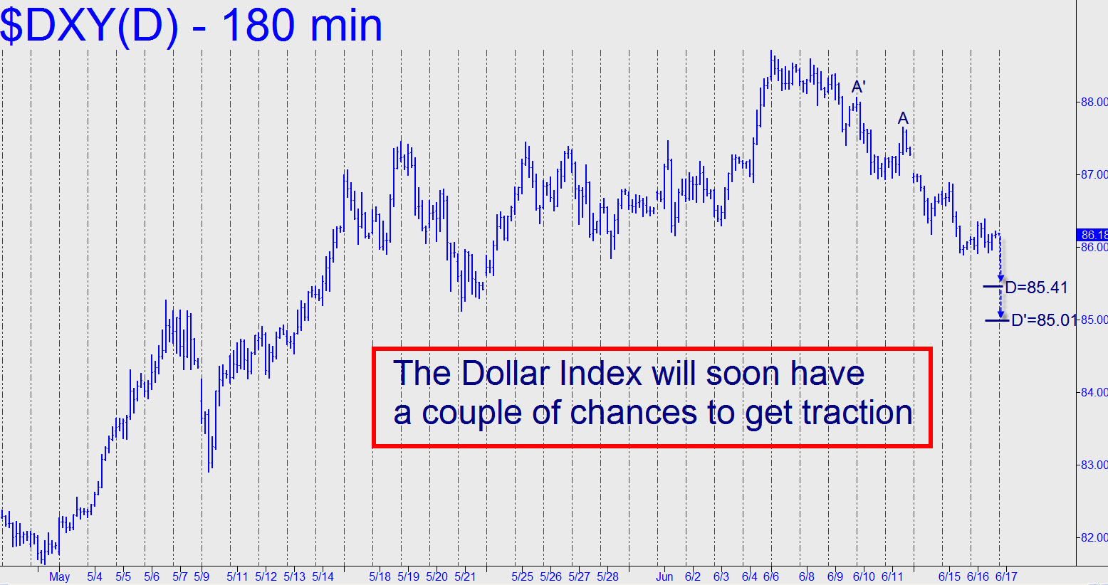 Backed into a corner by Europe’s unexpected move toward austerity, an intrinsically worthless U.S. dollar is not giving up without a fight. It will have a couple of chances to dig in its heels — at 85.41, my minimum downside objective for the near term; or if not there, at 85.01. These are both Hidden Pivot supports extrapolated from a 180-minute chart, which has been reproduced alongside. _______ UPDATE: DXY dive-bombed the Hidden Pivot support once again, this time getting even closer with an 85.45 low. As before, a breach will spell more downside to 85.01 precisely.