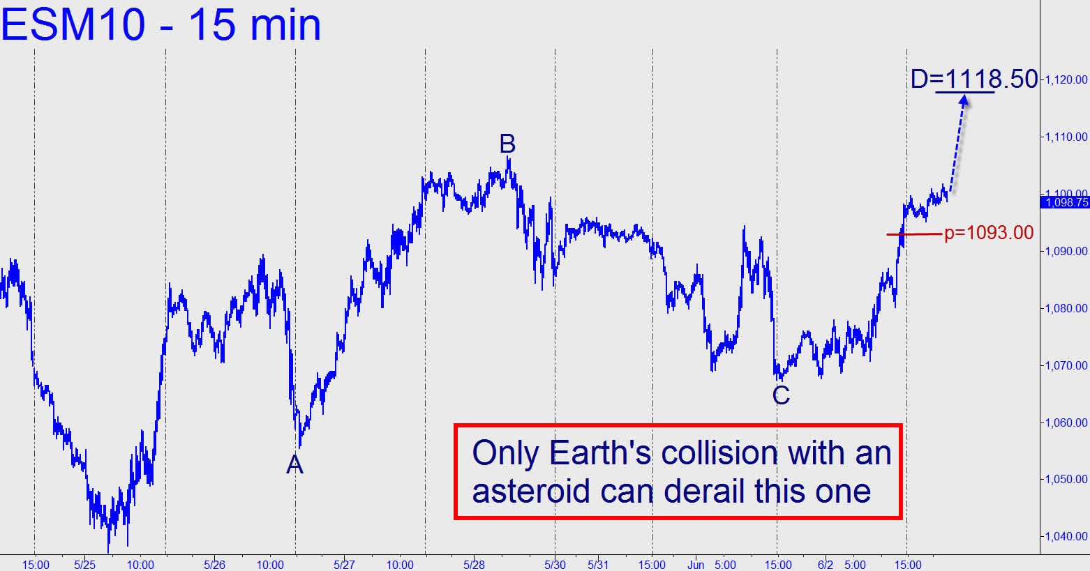I had thought the 1093.00 rally target furnished here yesterday would handle whatever silliness bub-bub-bubbled up. Apparently not. The number was the Hidden Pivot midpoint of the bullish pattern shown, and its breach portends more buying to its ‘D’ sibling at 1118.50. That number can be chiseled in stone, incidentally, since, as far as I can surmise, nothing short of a collision between Earth and an asteroid will prevent it from being reached. Since the trajectory of the rally is unlikely to be a straight line — especially with Monday’s highs in the way — turning the move into opportunity will be your task. I’d suggest betting the pass line in any case, since waiting to short the trend at 1118.50 with our customary three-tick stop-loss sounds so pat that I’d be heartbroken if it didn’t work perfectly.