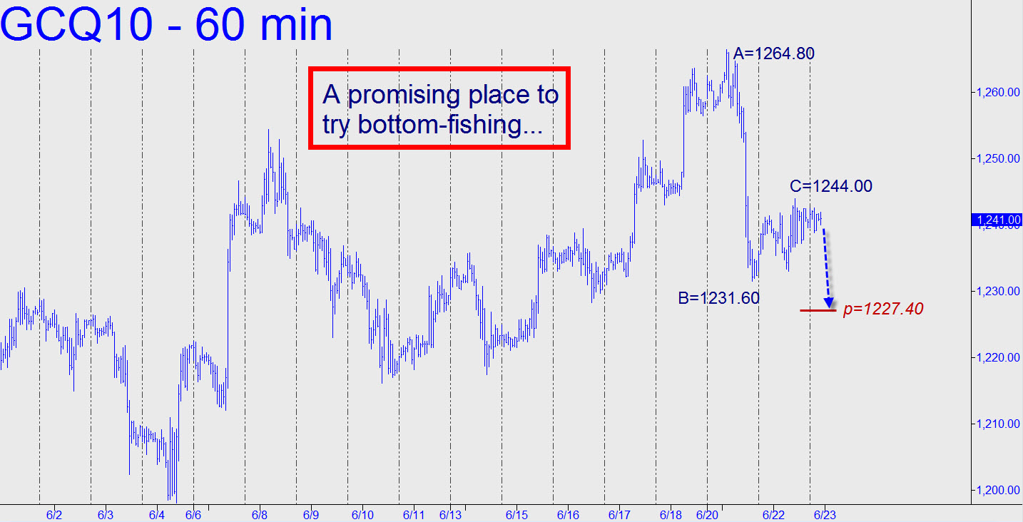 The hourly chart is still working on the bearish impulse leg begun Monday, implying that if the downtrend continues, we could hazard a bid at 1227.40, the midpoint support shown in the chart. The trade will remain valid as long as the point ‘C’ of the pattern, 1244.00, has not been exceeded. Please note that the futures would be indicating more downside to as low as 1210.80 if they close beneath 1227.40 or trade more than 2.50 points below it intraday. A six-tick stop-loss is suggested for the 1227.40 bid. Alternatively, a bullish thrust would be unimpeded to 1250.70, a midpoint resistance tied to a ‘D’ target at 1269.80. The first hint that bulls have regained control would come on a 1244.40 print, one tick above a look-to-the-left peak that is nicely visible on the 15m chart. ______ UPDATE (10:38 a.m. EDT): The futures ascended to a higher platform overnight before diving this morning, so we did nothing on the order. The new pattern projects to 1214.20, and because the selling has already breached the 1230.80 midpoint, we should infer the target is likely to be reached. To turn things around, bulls would need to punch the futures up to at least 1237.20 within the next couple of hours or or so.