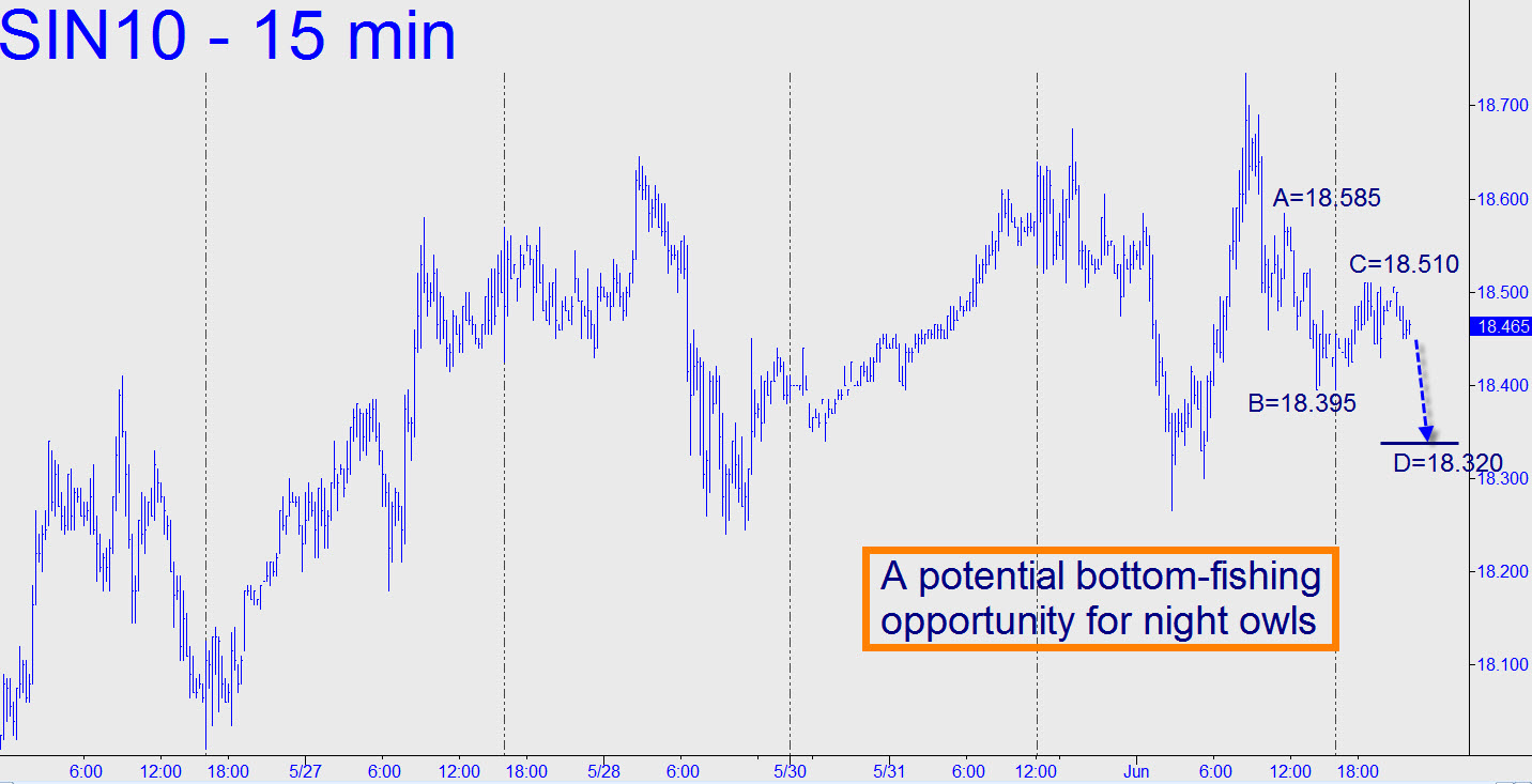As noted here earlier, a fairly important Hidden Pivot resistance at 20.170 looms as our minimum upside target for the moment, but an 18.795 midpoint resistance will need to be overcome first. Night owls can try bottom-fishing at 18.325, a tick above the Hidden Pivot support shown in the chart. A three-tick stop-loss is advised. ______ UPDATE: We were stopped out for small change when the futures fell overnight to a low at 18.090. That’s two cents from the target of a correction pattern that wasn’t fully formed until around 5:30 a.m. EDT, but it would have been tough to bottom-fish in any case, since the low was just above the target. In retrospect, only camouflage would have worked, and even that was no picnic.