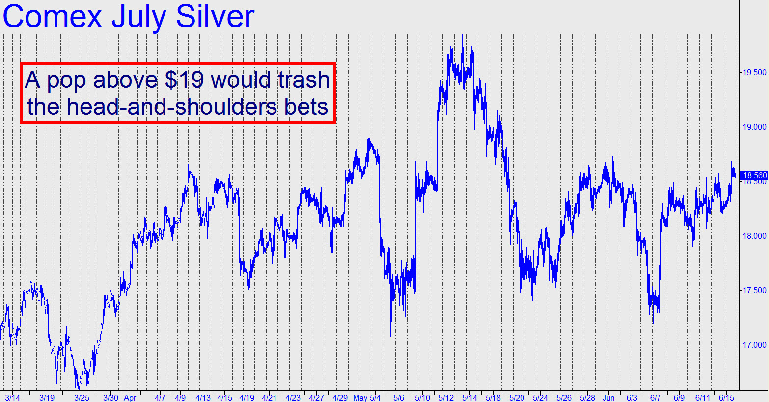 Silver kept the bull trend robustly alive with a spike yesterday that slightly exceeded a look-to-the-left peak at 18.585 recorded on June 1. The overshoot was just 3.5 cents, but that’s plenty enough to suggest that more upside awaits following tonight’s so-far gentle consolidation. A more daunting peak at 18.815 will be today’s challenge, but the futures looked to be in good shape to take it on as of around 8:25 p.m. EDT. A surge from here above $19 would provide a psychological boost as well, since it would badly compromise an all-too-clear head-and-shoulders pattern visible on the intraday charts.