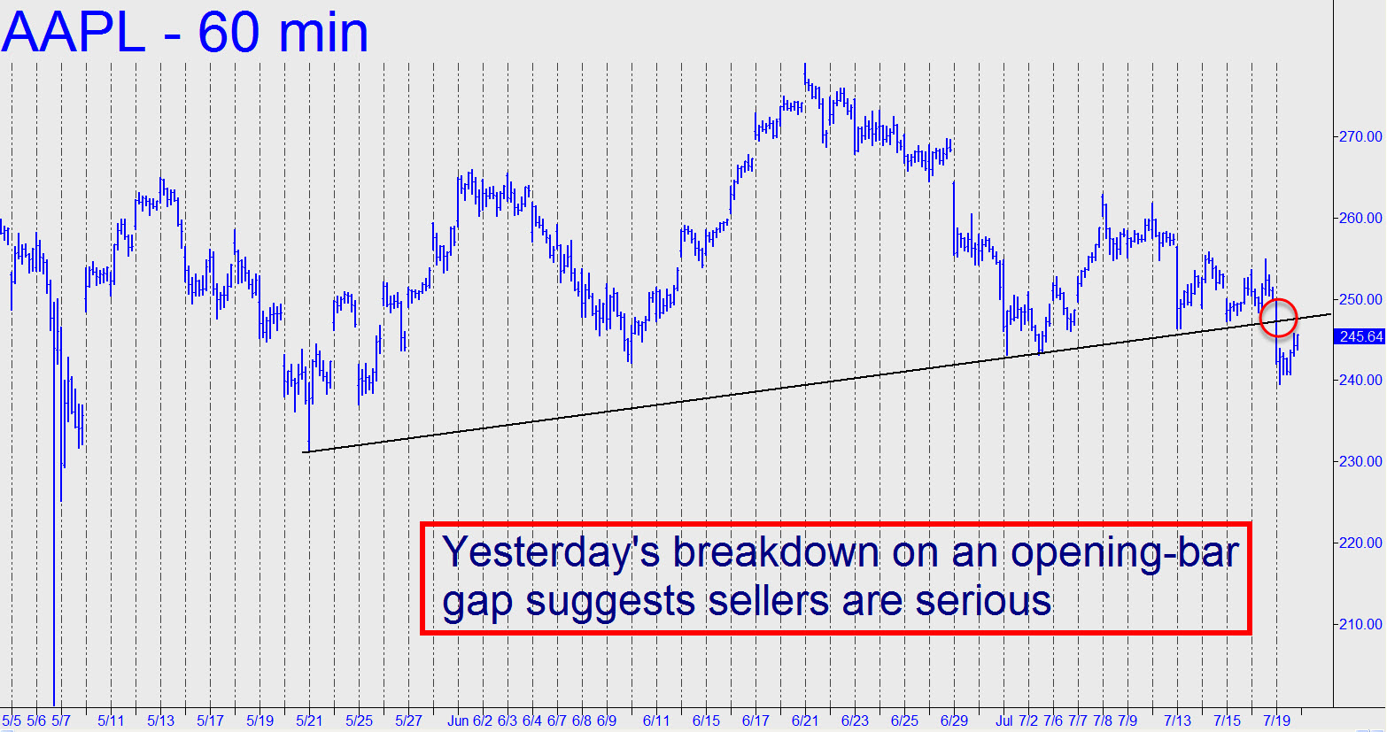 Apple not only shattered the trendline support we’ve been monitoring, it did so with a gap-down opening that left no doubts about sellers’ seriousness. We should now expect to see a move back up to the support, which comes in today around 247.63, rising to around 248.03 by day’s end. It’s hard to imagine Apple’s phenomenal marketing success petering out as long as Jobs is in charge, but perhaps the charts are predicting a creative dry spell? Expectations were pumped pretty high, so it wouldn’t take much of a fall-off in profits to trigger a nasty readjustment. If so, a Hidden Pivot at 227.09 will be a logical correction target, subject to dithering near 244.99, a Hidden Pivot midpoint, in the days ahead. Alternatively, it would take a thrust this week to at least 258.38 to reverse yesterday’s damage._______ UPDATE (2:13 p.m EDT): DaBoyz have tipped their hand, brazenly demonstrating to anyone who cares that any story-driven selling in this stock is just a shakedown to steal shares at fire-sale prices from widows and pensioners. Apple quickly reversed this morning after a manipulated gap-down opening, and then the stock made suet of trendline resistance with a so-far $10 rally off the lows. It’s no surprise that AAPL has attracted Wall Street’s criminal element, since it is one of the very few publically held American companies with a credible success story to hype.