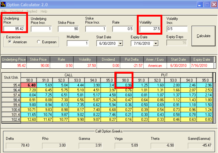 Were bulls saved by the bell? By my lights, the Diamonds were on their way down to at least 96.13, or possibly even 95.42, when yesterday’s session ended. If so and the lower number is approached, that would bring our short offer of four July 90 puts within range. Time decay has pushed down their value since I first suggested offering the puts for 1.40, however, and they would now be worth closer to 1.00 if the underlying vehicle hits 95.42 by week’s end. Accordingly, I’ll suggest lowering the short offer to 0.95, with 0.10 of discretion. The important thing is to short them irrespective of their price if and when DIA gets near 95.42. We continue to hold two August 98 puts for 1.06 and four July 96 puts for 0.70. I’ve included a snapshot of the calculator I used to determine a fair value for the puts. The 37.5 volatility comes from TradeStation. _______ UPDATE (Friday, July 2): DIA fell to 96.17 today — four ticks from the projected low — setting up the obligatory pre-holiday bounce/waft. Although there is zero buying interest other than very feeble short-covering, sellers still lack the inspiration and/or moxie to effect a washout. The 95.42 target is still valid, but bears should be cautious about the rally threat because of the precise bounce that has occurred from our first target.