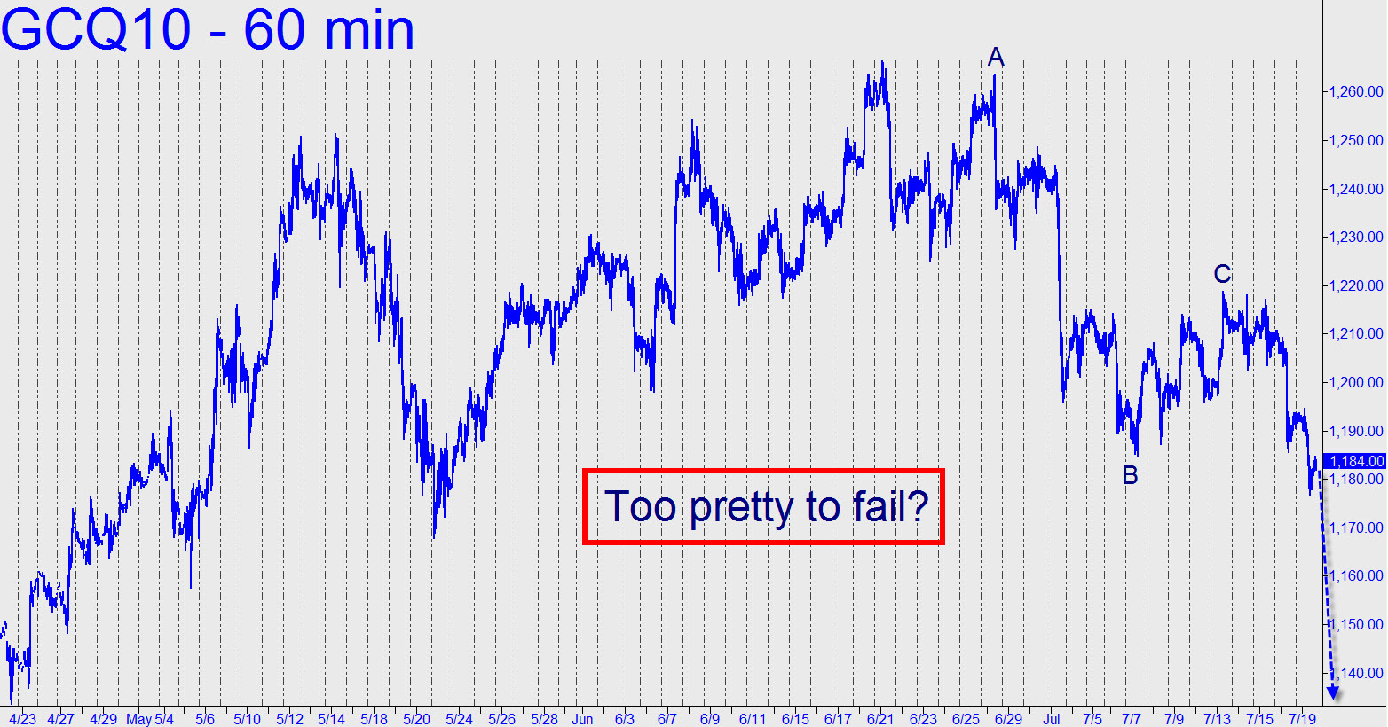 A fall to at least 1140.10 seems unavoidable, considering the weight and precision of the corrective pattern (see inset). It’s too pretty to not pan out, really, even though we should expect a bounce from above (or perhaps just below) the 1168.00 low recorded on May 20, as well as from the 1155.00 target of a lesser down-pattern. We’d want to judge any such rallies strictly, since, at that point, the burden of proof for the intermediate-term outlook will lie with the bulls. _______ UPDATE (1:10 p.m. EDT): Gold has paid scant attention to my forecast, diving nearly exactly to the midpoint of a pattern I’d overlooked (5-minute, A=1194.70 at 4:50 a.m. on July 19), then trampolining $18 on the recovery to a so-far intraday high of 1193.70. We shouldn’t be too impressed, however, since the high fell a dollar shy of yesterday’s peak — not to mention, $4.20 shy of a peak at 1197.80 “along the wall” of last Friday’s steep decline. Bulls will need to clear that hurdle before we take encouragement, let alone get excited. Still, it’s nice to see bears on the run for a change.