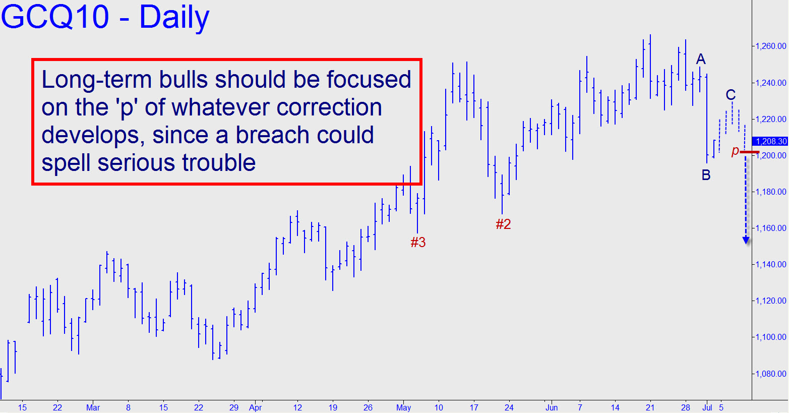 Concerning the technical picture, there is no question that yesterday’s slide did serious damage, creating the first bearish impulse leg of daily-chart magnitude since last June. That event had a bullish outcome, however, and we expect that this one will too. For starters, bulls will need a quick burst to at least 1222.90 today to turn the 15-minute chart in their favor. Alternatively, although I cannot yet predict with confidence how far this correction will go, we can glean a sense of its power in the subtlest rallies and corrections that occur over the next few days. Most immediately, as of around 11:45 p.m. EDT, a minor rally on the 15-minute chart projected to 1211 — $3 above the current price. If it is reached or exceeded, and if the subsequent correction fails to reach its ‘d’ target, that would be a bullish sign for Friday. Long-term bulls should be focused on the ‘p’ midpoint of whatever correction develops on the daily chart, since a breach could imply another leg down as nasty as yesterday’s or even worse. I’ve sketched out a possibility in the accompanying chart.