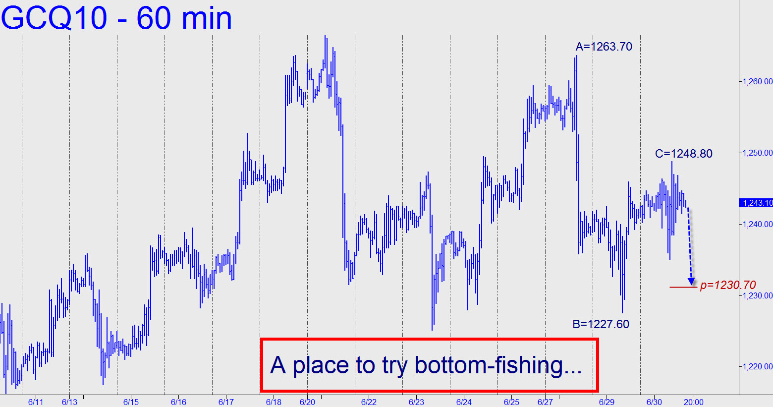 The futures remain in a delicate recovery, having topped two ticks beneath the 1249.00 rally target flagged here yesterday. Odds favor more weakness over the near term. Even so, I’ll recommend bidding 1230.80, stop 1230.40, if the futures fall to that price without having exceeded 1248.80 to the upside. The rationale for this trade is shown in the accompanying chart. _______ UPDATE (10:36 a.m. EDT): A flurry of weakness stopped us out this morning for a loss of about $40. Our 1230.80 target was a midpoint pivot tied to a ‘D’ at 1212.80 that should be viewed as a “back-up-the-truck” buying opportunity. The next stop below is 1223.30, but it’s possible the futures will hold here, at least for today, since they may simply be homing in on the “structural” support represented by Tuesday’s low, 1227.60. _______ UPDATE (1:10 p.m. EDT): The decisive breach of 1212.80 by $7 has created a bearish impulse leg of daily-chart degree. The last time this occurred was exactly a year ago. Gold subsequently rallied for a few days and took one more nasty leg down before embarking two weeks later on the powerful rally that achieved the recent high at 1266. _______ UPDATE (2:41 p.m. EDT): The tradable low came at 1213.00, two ticks above the pivot, but produced a bounce of just $5 before the futures relapsed and headed much lower. Breakdown stops could have been anywhere from 1207.30 to 1205.50, yielding a loss of as much as $750 per contract if no partial profits were taken on the bounce. I would not suggest carrying a position overnight, since the selling here is the most persistent and powerful that I can ever recall, blowing out Hidden Pivot supports effortlessly.