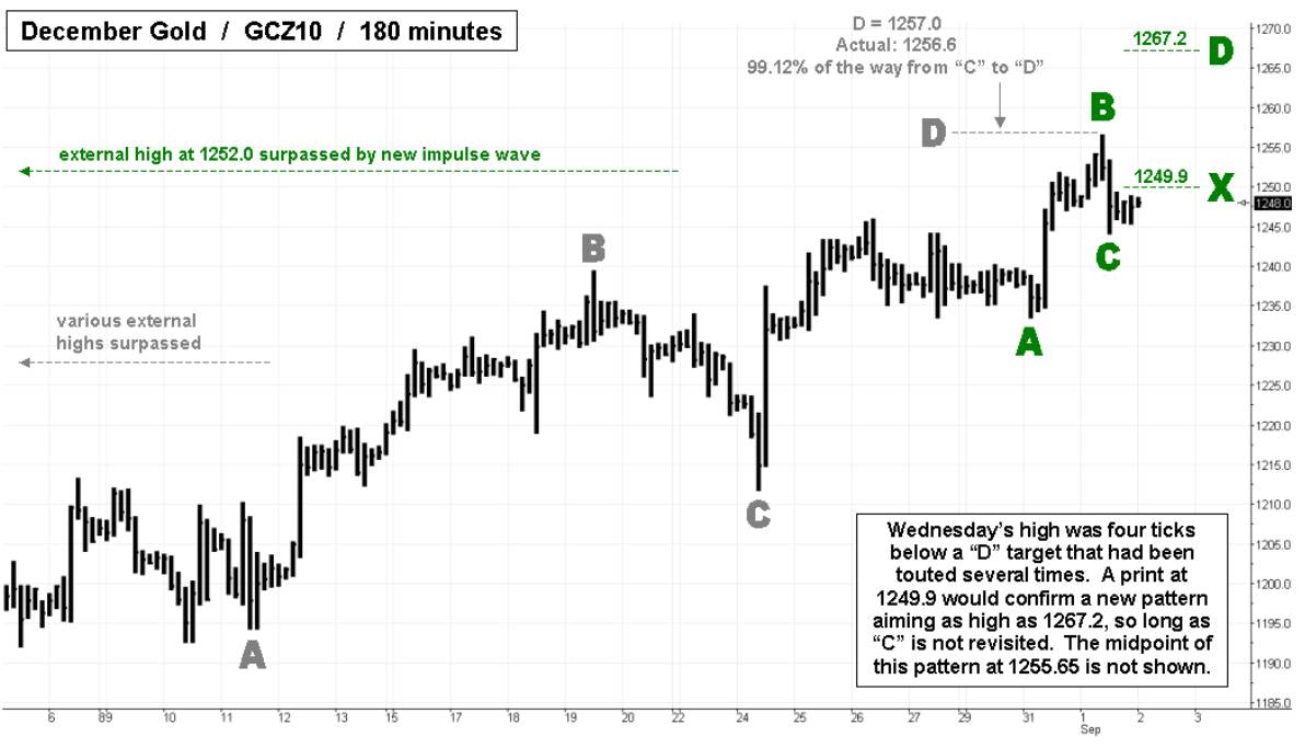 On Wednesday, gold bounced off of a Hidden Pivot that had been touted several times, and in the process traced out a new pattern, not yet confirmed, whose “D” target is near the all-time high. The Wednesday high was four ticks below our 1257.0 “D” target (mentioned yesterday and in earlier touts), and a quick decline of more than twelve dollars followed. So long as this 1244.1 low is not revisited, a print of 1249.9 would confirm a new, smaller pattern with a midpoint at 1255.6 and “D” target at 1267.2. Traders should continue to bear in mind Friday’s non-farm payrolls announcement, an event which has at times been preceded or immediately followed by heavy selling of gold futures. (Posted by Doug McLagan)