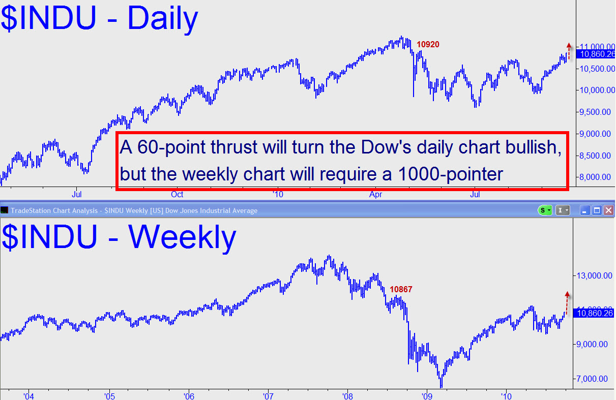 The Mother of All Bear Rallies wafted on Friday to within easy distance of re-igniting a bull trend that had seemed unstoppable until last spring. Back then, buyers who had driven the broad averages higher for fourteen months at an unsustainable, 45-degree pitch went limp, sending stocks into a vexatious roller-coaster ride of thousand-point ups and downs that have defied easy categorization as either consolidation or distribution. However, the bulls will have a chance to take charge unambiguously on Monday when shares begin to trade, since it will take a mere 60-point rally, to 10921, to turn the Dow’s daily chart bullish. We should note, however, that that wouldn’t quite clinch the bullish case for the longer-term, since a thousand-point rally to at least 11868 is needed.