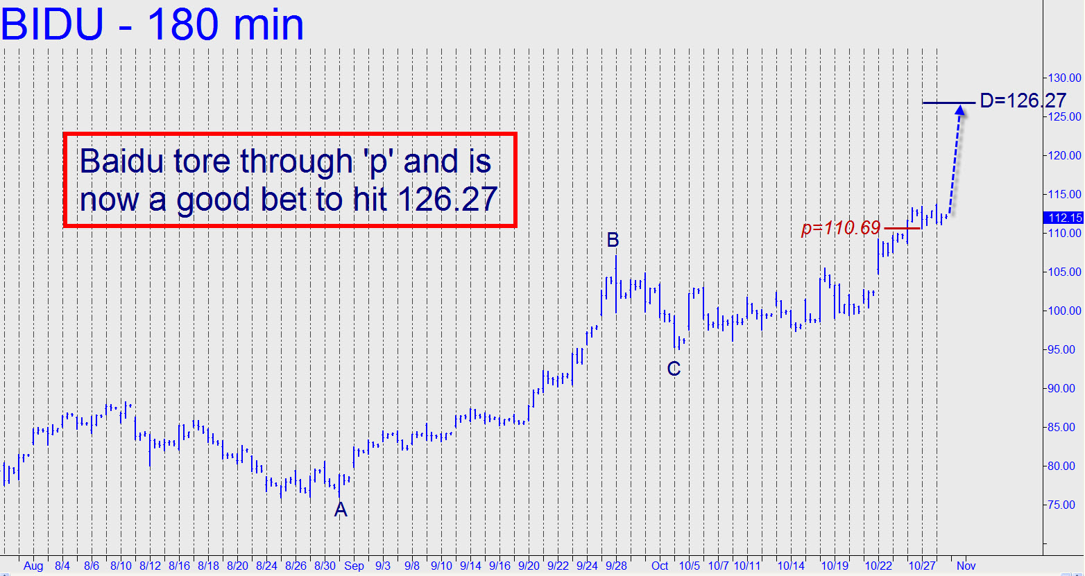 Someone touted this stock in the chat room yesterday and, truth to tell, it doesn’t look too bad. The company provides Chinese and Japanese language Internet search services. The nearest Hidden Pivot resistance lies at 126.27, and I’d rate it a 90% shot of being reached within the next 2-3 weeks, if not sooner. What all but clinches the strongly bullish outlook is the way the stock blew through a clear-as-day midpoint resistance earlier in the week. ________ UPDATE (Monday, November 1, 3:11 p.m. EDT): Four days after this tout was published, BIDU has eased to a so-far low of 107.58. If this is just a garden variety correction of a still-strong bull, however, the stock should turn from 107.02. Anyone interested in acquiring the stock for speculative purposes should bid just above that pivot, risking, oh, 15 cents, on the stop. Officially, we’ll be bidding 107.04 for 200 shares, stop 106.89). _______ FURTHER UPDATE (4:51 p.m. EDT): We lost $30 testing the water. The stock’s low at 106.85 overshot the midpoint target by 17 cents, implying BIDU will now head down to the related ‘d’ target at 104.88. We’ll try again, bidding 104.93 for 200 shares, stop 104.63. Unofficially, however, you could start looking for a camouflage entry opportunity if BIDU gets down to 105.40, since there’s always a chance that the correction of a strong bull trend will end without having quite reached the ‘d’ target of an abcd retracement. _______ FURTHER UPDATE (Tuesday, Nov 2): The low at 106.85 proved to be the launching pad for a so-far $3 rally, so we had no horse in the race. At least one chat-roomer reported sticking with the trade, however, after having used a wider stop-loss than I’d advised.