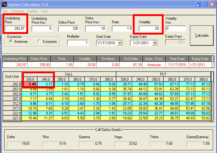 Ready to try another butterfly? We racked up a theoretical profit of $1360 the last time around, so it’s only natural to want to do it again. This time, although I have no specific rally target in mind, we’ll be betting on the likelihood that AAPL shares will continue to move strongly higher over time. But first they look likely to correct some more — presumably down to a Hidden Pivot support at 292.87. With the goal of legging into the January 330-340-350 call butterfly at no cost, let’s start with the purchase of two January 330-340 call spreads if and when AAPL falls to the 292.87 target. The spread closed yesterday for 1.90, but we should be looking to pay no more than 1.25-1.30. I’ve included a snapshot of an option calculator that shows how I estimated fair value. The volatility estimate, 29, comes from TradeStation and is crucial to my assumption. ______ UPDATE (12:02 p.m. ET): Far from correcting, Apple has used the stock market’s broad rally today to reassert its primacy as the highest-beta stock of them all. AAPL is up more than $8 at the moment, so we can forget about stealing the January 330-340 spread for relative pennies. Assuming the rally continues — a safe bet, since the company is one of a bare handful of firms in America that are making money the old-fashioned way, hand-over-fist — we’ll consider legging into the butterfly from the opposite direction — i.e., shorting the January 340-350 call spread when AAPL approaches a Hidden Pivot rally target. _______ FURTHER UPDATE (Sunday, November 21): There are innumerable ways in which things could play out this week, but if any of the possibilities has the potential to yield an edge as we contemplate legging into bullish butterfly spread, I will signal it both here and in the chat room via an intraday alert.