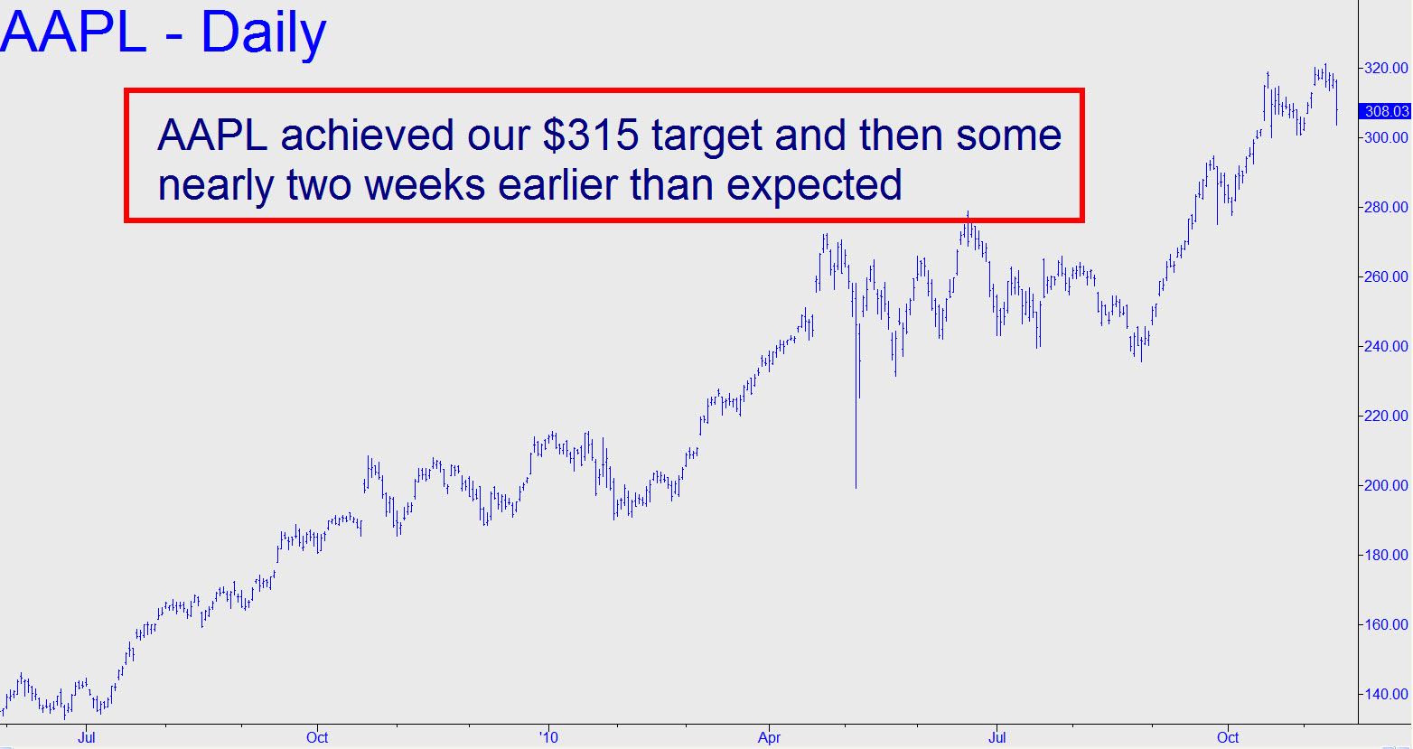 Our theoretical gain on the two Nov 300-310-320 butterfly spreads we’d held until Friday was $1360 — about 35 times the sum we’d put at risk. I advised closing out the position in the chat room, and also via an intraday update to the AAPL tout, when the stock was crossing the “equator” of maximum profitability at $310. AAPL did so not only on the way down from $316 that day, but on a subsequent bounce to 310.91 from 303.63, the intraday low. If you missed exiting you can do so this week at will. Even if you were to receive just $6 for the spread, your theoretical reward:risk would still have been 30:1.