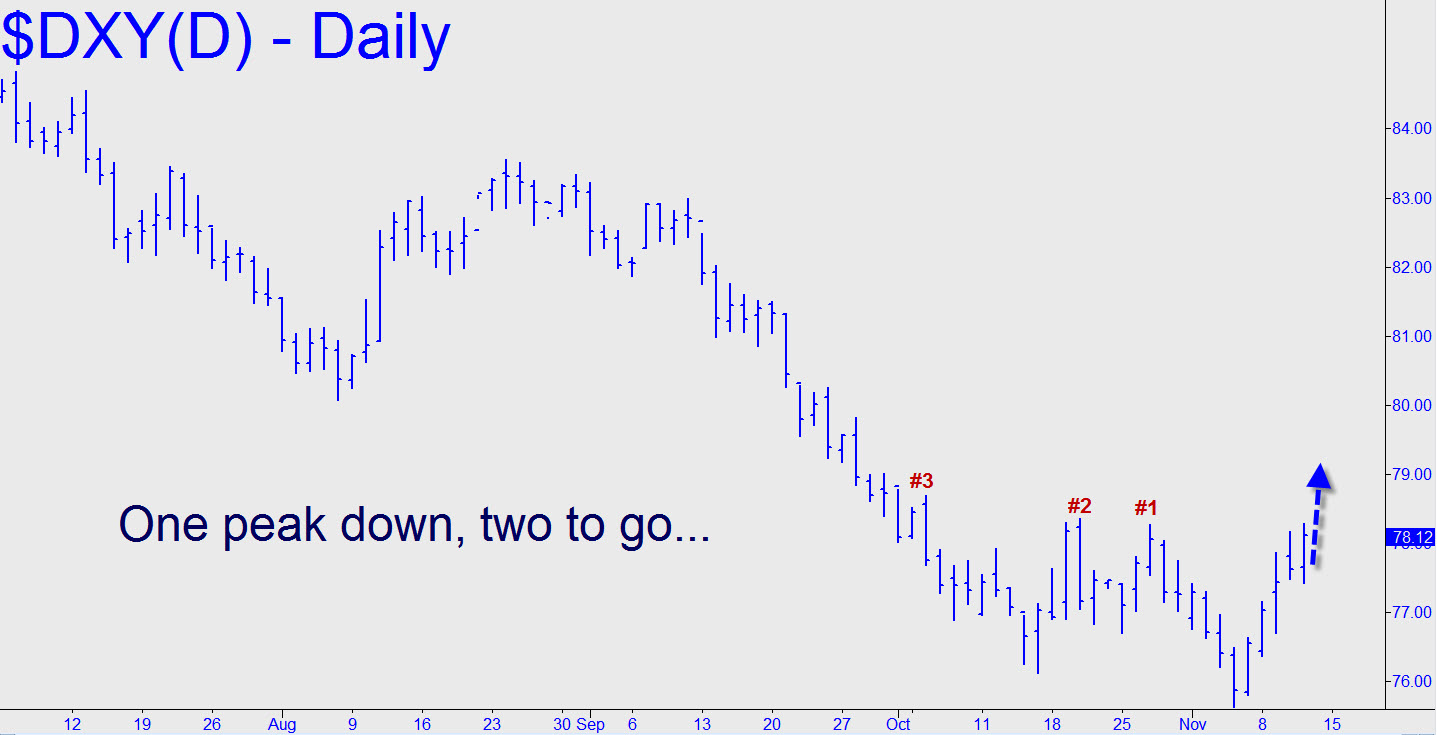 It’s quite a challenge for me to keep from trash-talking the dollar, since I admittedly lack the imagination to find an even remotely plausible reason for it to rally — other than a purely technical one. Be that as it may, yesterday’s logic-challenged thrust surpassed the first of three peaks on the daily chart that will need to be dispatched to clear the way for an intermediate-term rally of perhaps 3-4 weeks. Accomplishing this would require a mere puddle jump to 78.70, just 0.41 points above yesterday’s 78.29 high. This modest feat seems a foregone conclusion at this point but we’ll hold the one-handed applause until such time as it actually happens.