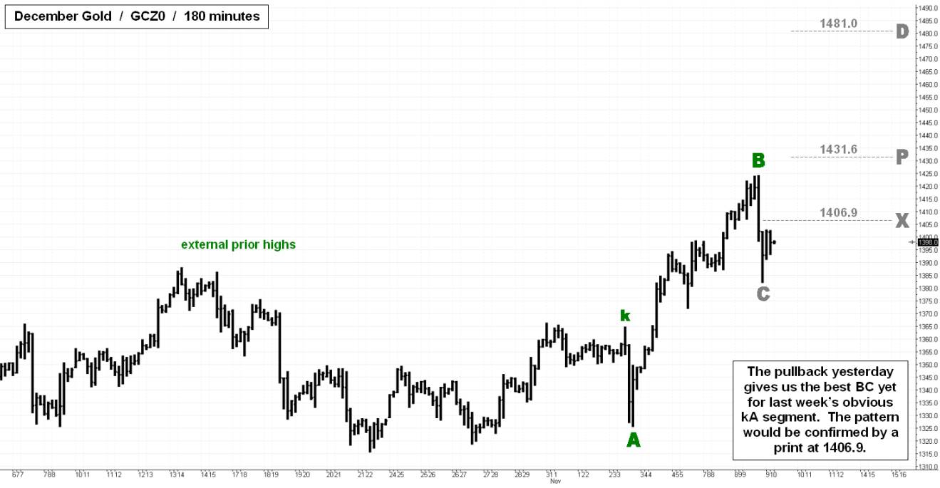 If gold is finished with its pullback, it will soon confirm important new bullish targets at 1431.6 and 1481.0. Yesterday’s forty-two-dollar decline in the gold futures from an all-time high has created a pattern with striking symmetry between the pullback and last week’s “kA” segment. If the “C” point at 1382.3 holds and the futures move back up, they will confirm this new pattern and the aforementioned targets, as pictured in the attached graphic. The odds of this happening will be diminished if gold trades down a few dollars to 1392.3 and does not revisit the current session high of 1402.9. This would confirm a smaller, bearish pattern which was initiated by the drop yesterday and would suggest a move down to 1381.9, a midpoint pivot, and to 1360.8 if the midpoint gives way. This midpoint would be a risky trade, as it is just below the “B” point made by yesterday’s low, but the sibling “D” target of 1360.8 can be bought with an order a few ticks higher and a stop at 1359.9. Pivoteers should recalculate the targets if 1402.9 is surpassed, thus moving the “C” point higher, and a decline follows. (Posted by Doug McLagan) _______ UPDATE (9:45 a.m. ET): The bullish pattern has been confirmed, and the bearish pattern has been activated with a higher “C” point of 1410.0. Buyable pivots are now at 1389.0 and 1367.9, so long as 1410.0 holds.