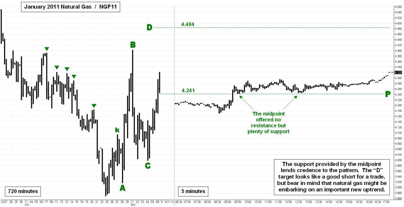 Yesterday’s trading supports the notion that natural gas has embarked on an important new uptrend, and traders should look for ways to play the long side. Today we will consider the January 2011 contract, for several reasons: the rollover process is well underway, with January’s open interest now higher than December’s; January gives us more time to buy and hold; and the January contract has seen some significant action around the midpoint of the pattern that we are watching. Natural gas rewarded traders who were able to get long the futures as we advised yesterday. A minute after the pit opened (at 9:00 a.m. in New York), a small pattern began forming which offered potential camouflage in the December contract and perfect camouflage for anyone who happened to be watching the January chart. These patterns played out with rallies that never looked back, delivering gains of as much as fourteen cents thus far. Both contracts blasted through the midpoint of the pattern we described yesterday, and the January contract pulled back to nearly touch the midpoint more than once before pulling away to the upside, as pictured in the attachment. Traders not already on board should look for small patterns that create buying opportunities. The “D” target of 4.484 looks good for a short-side trade with a stop at 4.491, but don’t ignore the possibility that a long position might take you a lot higher than that. (Posted by Doug McLagan)