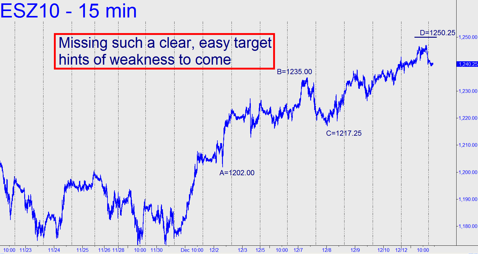 Pretty amazing. The futures had all night and a full day to rally just seven points to a Hidden Pivot target, and yet they somehow failed. More amazing still is that they will likely continue higher in the days and weeks (months?) ahead despite mounting evidence that there is almost zero buying interest. This seeming paradox exists because short-covering is always lurking in the shadows to pop shares higher. It usually take a little news, any news, to trigger a squeeze, but yesterday there was no news whatsoever. (Granted, Brett Favre won’t be starting tonight against the Giants, but we wouldn’t have expected that story to move the markets.) The 1250.25 target remains valid nonetheless, and you can try shorting there with a stop-loss as tight as 1.00 point. However, it is a sign of incipient (and presumably short-lived) weakness that the futures died more than three points shy of an easy target. The pattern with which it is associated is shown in the accompanying chart.