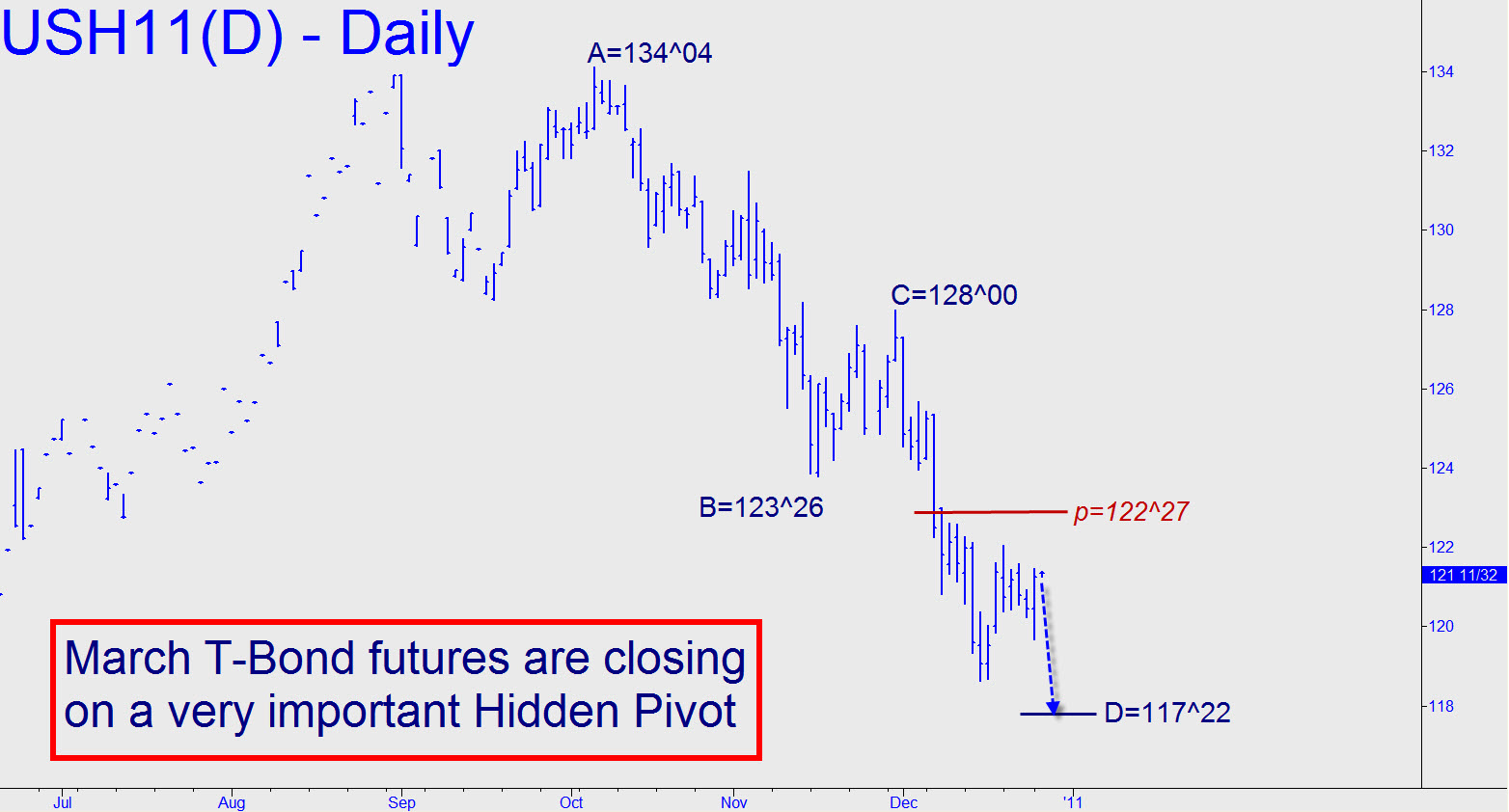 We’ve analyzed the T-Bond bear market closely during the Wednesday tutorial sessions, but here’s a picture for the tout section that can be archived. Because there is such clarity in the 117^22 target and the daily-chart pattern that produced it, we should confidently expect more weakness down to at least 117^22. Also, any rally to the midpoint pivot, 122^27, should be regarded as an opportunity to try shorting with a tight stop-loss. ________ UPDATE: On second thought, we’ll pass on any opportunities that may arise to short 122^27, since it’s possibility such relative heights could be achieved simultaneously with the creation of a powerful impulse leg on the intraday charts.