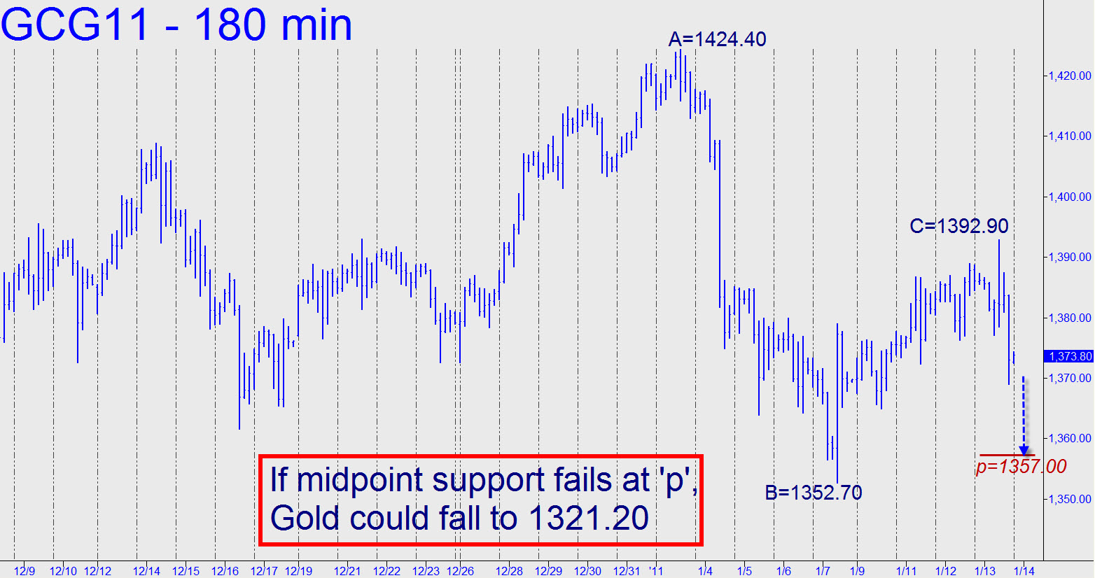 A day-long snoozefest featured the obligatory price hump early on in the session. February Gold went on to peak at 1392.90 — exactly $1.60 above the forecast high. From there the futures have fallen sharply, and presumably gratuitously, touching a low of 1369.10 at 4 p.m. ET. The key number for today is the 1357.00 midpoint support of the pattern shown. If the futures close beneath it, that would be telegraphing more downside to as low as 1321.20, its ‘d’ sibling. FYI, the 1357.00 target can be bottom-fished with a stop-loss as tight as four ticks off a 1357.10 bid. _______ UPDATE (11:11 a.m. ET): The futures have come down hard, breaching the stop with a so-far low at 1356.10 that would have produced a theoretical loss of around $50.