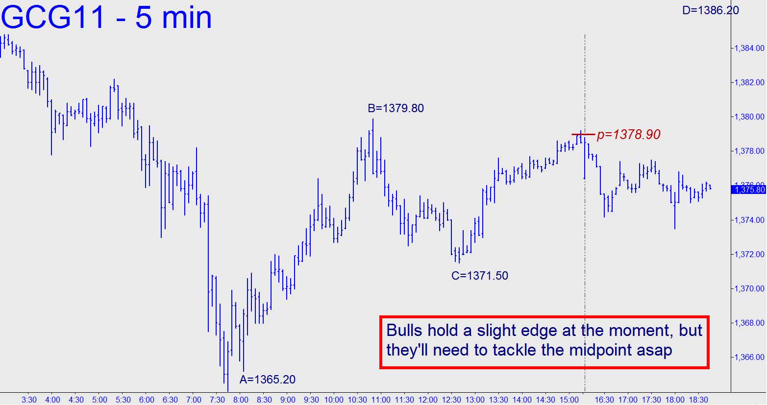 A prior low at 1352.00 can still serve as a bearish tripwire, since any downthrust that exceeds it would create an impulse leg of daily-chart degree. The intraday charts remain short-term bullish nonetheless after yesterday’s $16 rebound off the lows, but buyers will have to push the futures decisively past 1378.90, the Hidden Pivot midpoint of the pattern shown, to seize the advantage. That would be telegraphing more upside to at least 1386.20. Alternatively, if there’s a dip below 1371.50, the point ‘C’ of the pattern, we should infer genuine weakness rather than bullish accumulation.