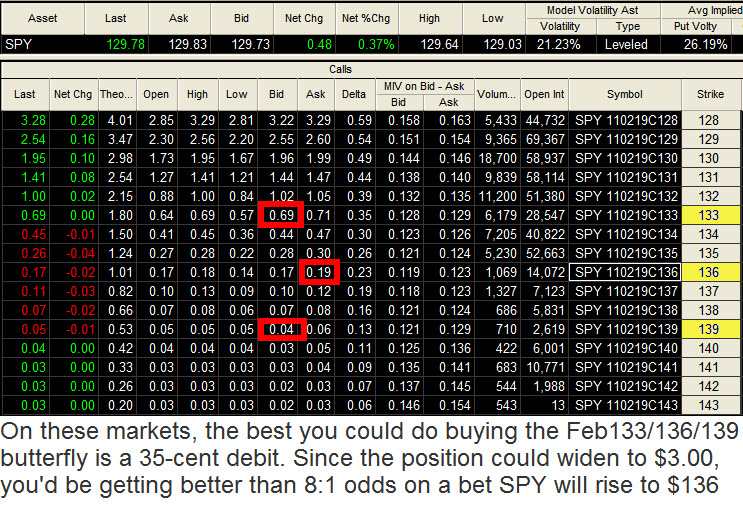 SPY appears hellbound for at least 136.25, a Hidden Pivot that comes from the weekly chart, where A=87.00 on July 10. Let’s try a very low-risk directional play, butterflying the Feb 133/136/139 strikes. To put the position on, and to virtually eliminate theoretical risk, we’ll need to short two Feb 136 calls for as much as we pay for the offsets — a single Feb 133 call and a Feb 136 call. That would effectively be “doing” the butterfly for “even’ (i.e., no credit or debit), and it would yield a maximum theoretical profit of $300 per butterfly with the stock trading at 136 on expiration day (February 18). We’ll want to be careful about putting on this position, since little errors in a three-sided position can whittle away our edge. We may wind up legging into the position by buying a Feb 133-Feb 136 vertical bull spread when SPY dips to a Hidden Pivot low, and then shorting a Feb 136-Feb 139 call spread on a subsequent rally. Those two action together add up to: long 1 Feb 133 call; short 2 Feb 136 calls; long one Feb 139 call. However we do it, I will signal the appropriate strategy intraday in the chat room and by way of an update to this tout. This may seem like a lot of hard work, but I am going to work hard myself in an attempt to make back for you the cost of a one-year subscription.