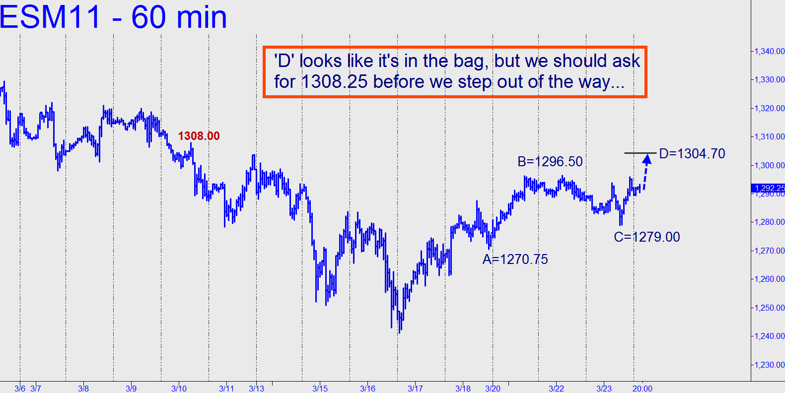 Looks like traders are scampering up the Wall of Worry once again. The market had a dozen good reasons to sell off yesterday — and it did, at least for a while; but when the dust settled, easy money had once again had its way. Each time the E-Mini S&P pokes its greasy little snout above structural resistance, the sellers — mostly corporate insiders, if we are to believe what we read — seem to melt away. Now, a Hidden Pivot resistance at 1304.75 is the likely objective of the next thrust. Since its sibling midpoint at 1292.00 has already been exceeded by four points, this move should be regarded as an odds-on bet. If DaBoyz act a little gutsier, though, they’ll go the extra yard with a push past a look-to-the-left peak at 1308.00 shown in the chart. If and when that occurs, bears once again had better dive for cover.