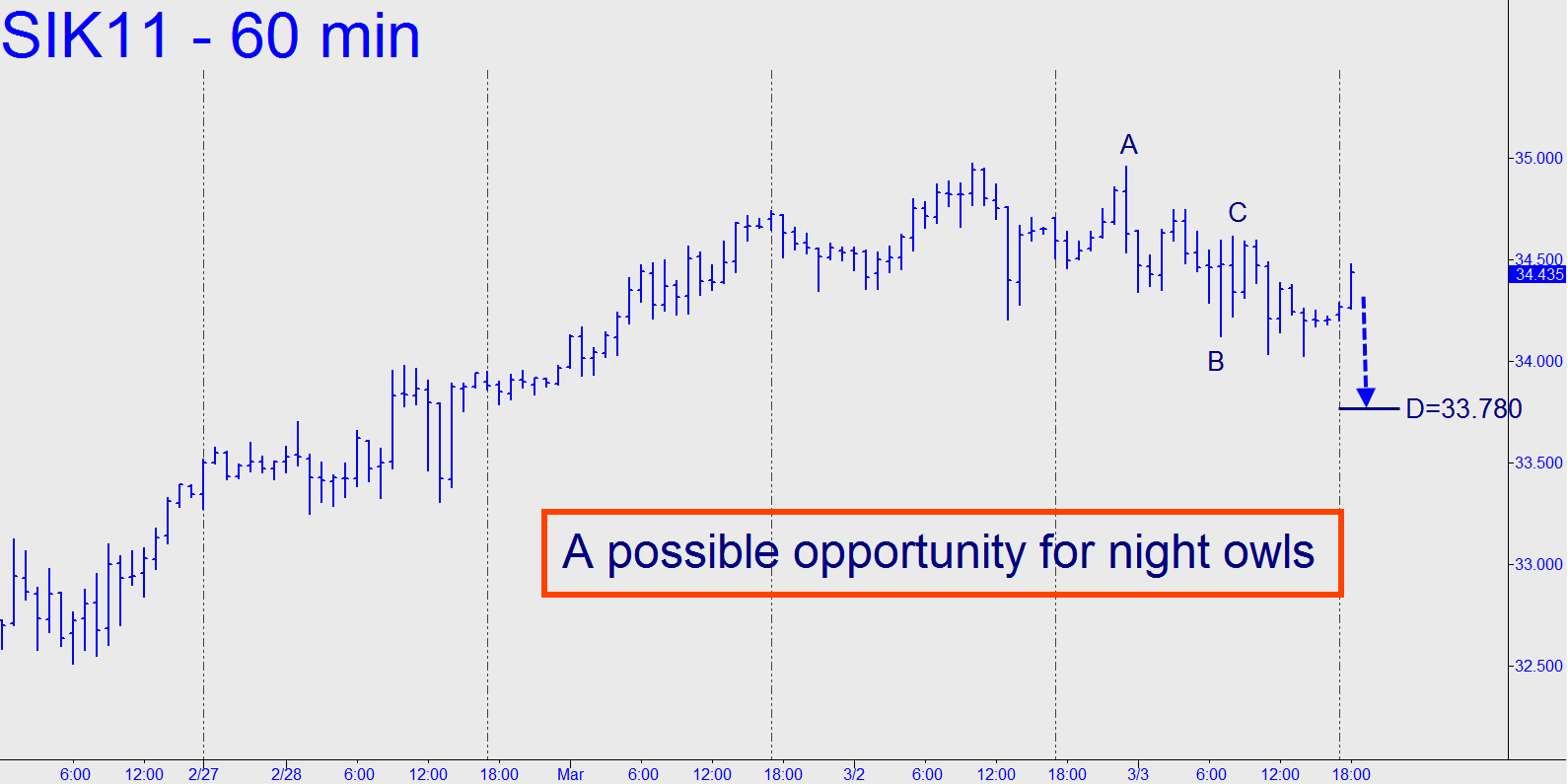 I like the 33.780 Hidden Pivot shown in the chart for bottom-fishing today, although it doesn’t come with an ironclad guarantee. A three-tick stop-loss should suffice, since the pattern is formed from three delicately precise coordinates. FYI, I took a 20-minute break after writing the foregoing, and now, as of around 7:30 p.m., the futures were in a moderate rally that diminished the appeal of the pattern. The bottom-fishing strategy will remain viable, however, as long as the point ‘C’ of the pattern, 34.615, is not exceeded to the upside.