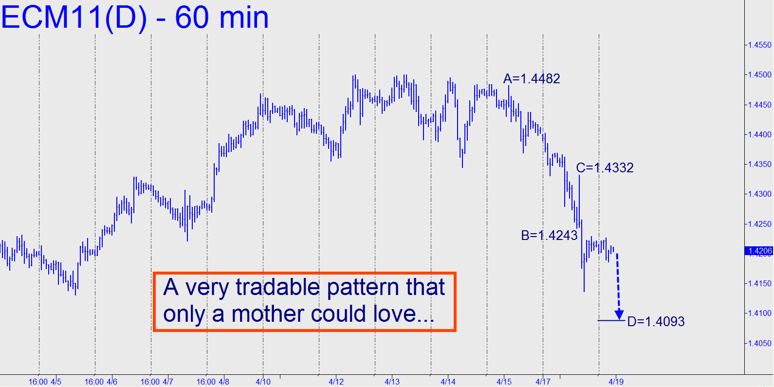 A 1.4093 Hidden Pivot given here yesterday remains an unorthodox spot to try bottom-fishing with a very tight stop-loss. I’ve included a chart that shows the provenance of the target. This interpretation was inspired mainly by my fetish for a sequence of single-bar coordinates here that is as unintuitively abc-like as tradable patterns come. _______ UPDATE (April 21, 10:53 a.m. EDT): Tracking the little sonofabitch diligently may be more trouble than it’s worth, since the euro moves precisely to its targets when most people I know, including me, are sleeping. It has just done so again, hitting a high this morning at 1.4631 that lies just 0.0006 points from the ‘D’ target of this in-your-face pattern on the hourly chart: A=1.4000, B=1.4500, and C=1.4137.