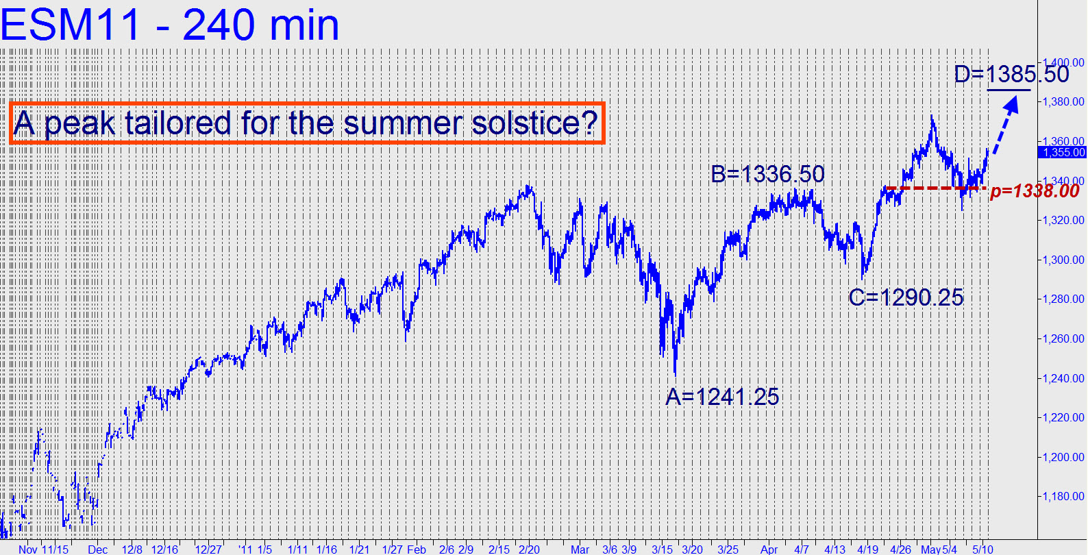 I hung out a 1358.25 target a short while ago, so let’s try shorting there with a 1.00-point stop-loss. This is probably more easily done during the night session, since morning could bring a gap-up opening, so take extra care. There’s a quite important target above it, at 1385.50, that should be held in mind as a possible top for the summer. To my eye, price action at the midpoint strongly supports the viability –and accuracy — of the target itself. Please note that if the even larger rally pattern evident in this chart plays out — i.e., the one starting in the lower left-hand corner — the futures could go as high as 1415.00. ______ UPDATE (9:55 a.m. EDT): Turns out we didn’t need the 1.00-point stop-loss, since the futures peaked overnight precisely at 1358.25 — a dead-center bullseye. Assuming two contracts were shorted, cover half here, at 1352.75, and use a 1357.50 stop-loss for what remains. I’m not recommending a trailing stop, at least not yet, because we’ll be swinging for the fences on this one.