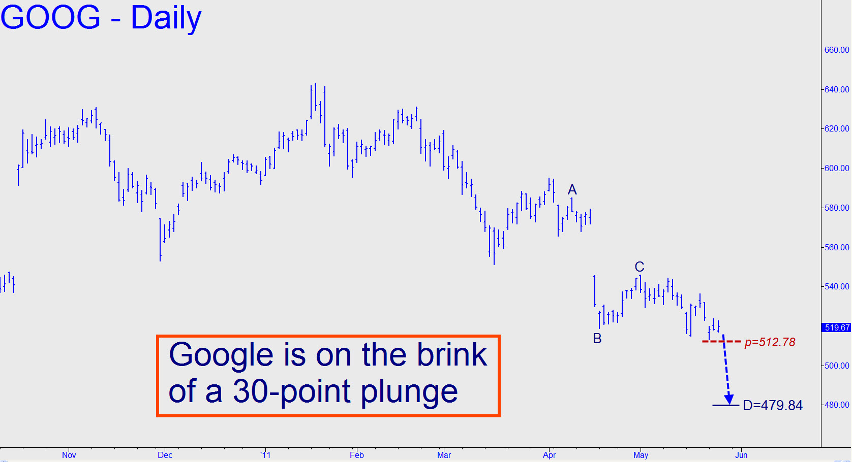 The stock looks like it’s setting up for a 30-point dive to a Hidden Pivot support at 479.84. The so-far low of a correction from 643 that is now entering its fourth month is 513.40, just 62 cents from the Hidden Pivot midpoint at 512.78. ‘Camouflage’ shorts are advised, but keep in mind that you’ll need to be on charts of 15-minute degree or less in order to nail the minor swings with the to-the-penny-accuracy that successful ‘camo’ trading requires. In any event, we’ll look to botom-fish if and when GOOG reaches the target. _______ UPDATE: We’ll put this trade aside for now, since the stock is currently rising, evidently disinclined to breach the midpoint support.